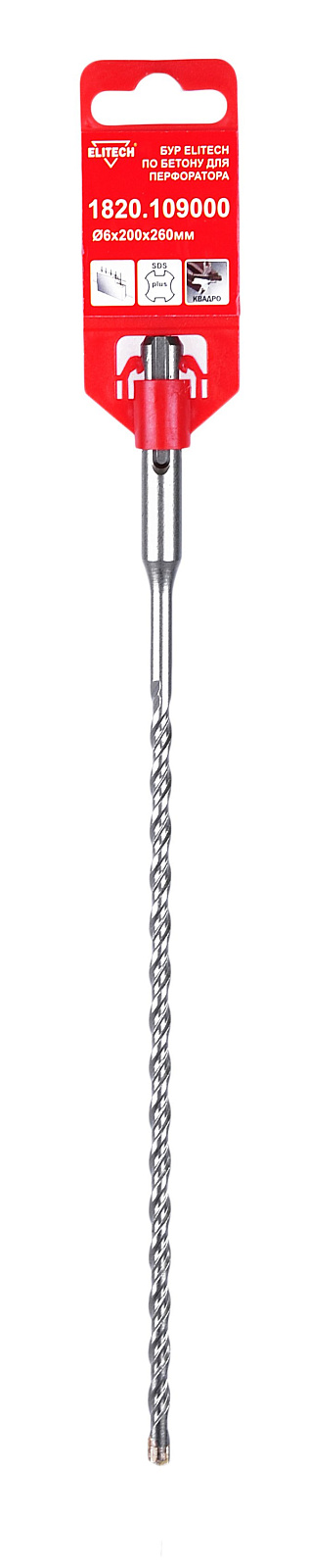 Квадробур по бетону диаметром 6 мм и длиной 260 мм с четырьмя твердосплавными режущими кромками и двойной спиралью для перфораторов с патроном SDS-plus, представляет собой инструментальную оснастку, с помощью которой можно сверлить отверстия в конструкциях, изготовленных также из кирпича, натурального и искусственного камня.