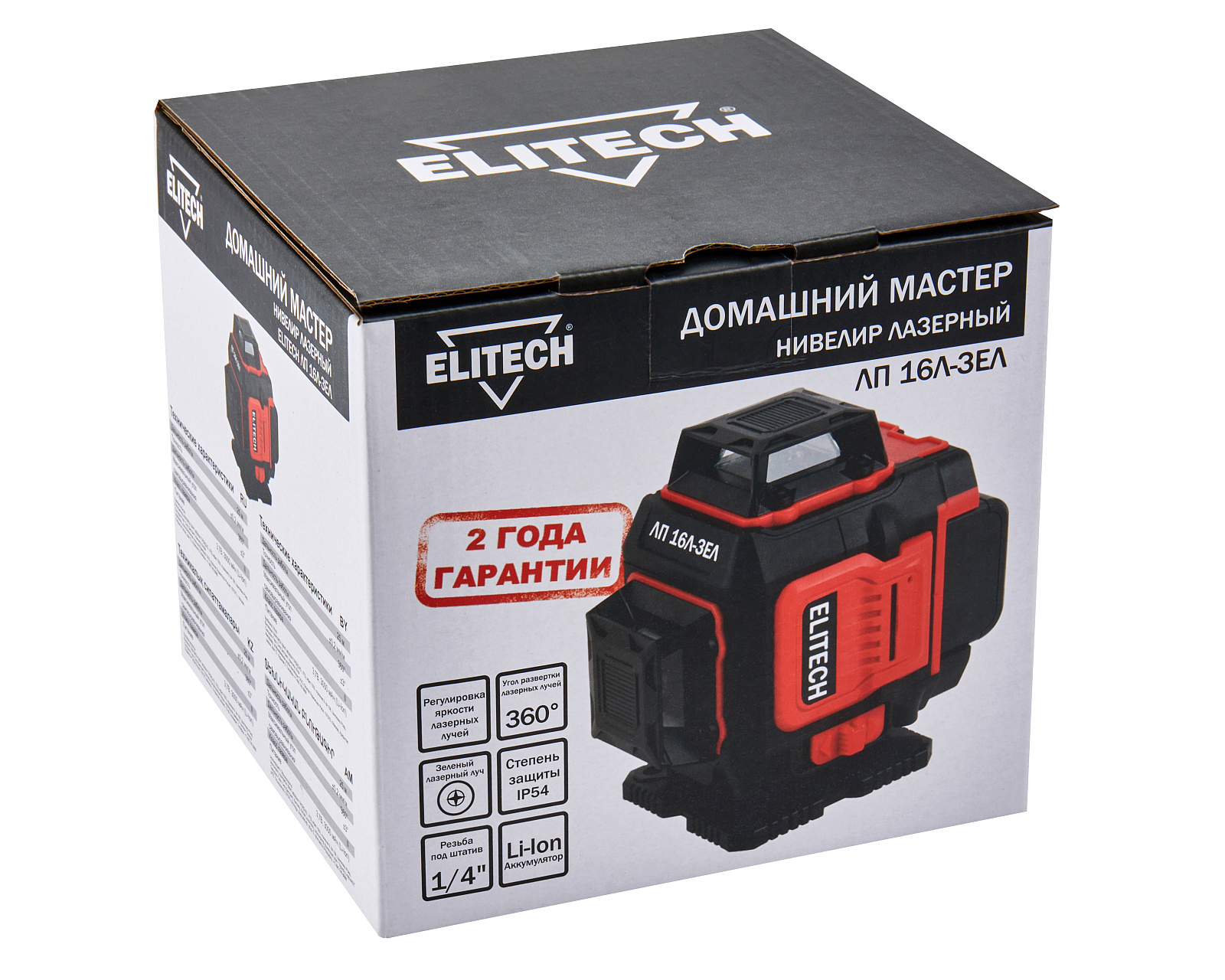 Лазерный нивелир ELITECH ЛП 16Л-ЗЕЛ с дальностью до 25 м и углом развертки в 360 градусов, проецирует 16 зеленых лучей, образуя 4 плоскости (2 горизонтальная и 2 вертикальных). Пересечения линий образуют 10 точек - под прибором (надир), над прибором (зенит) и 8 точек в плоскости прибора с углом 90° между собой.