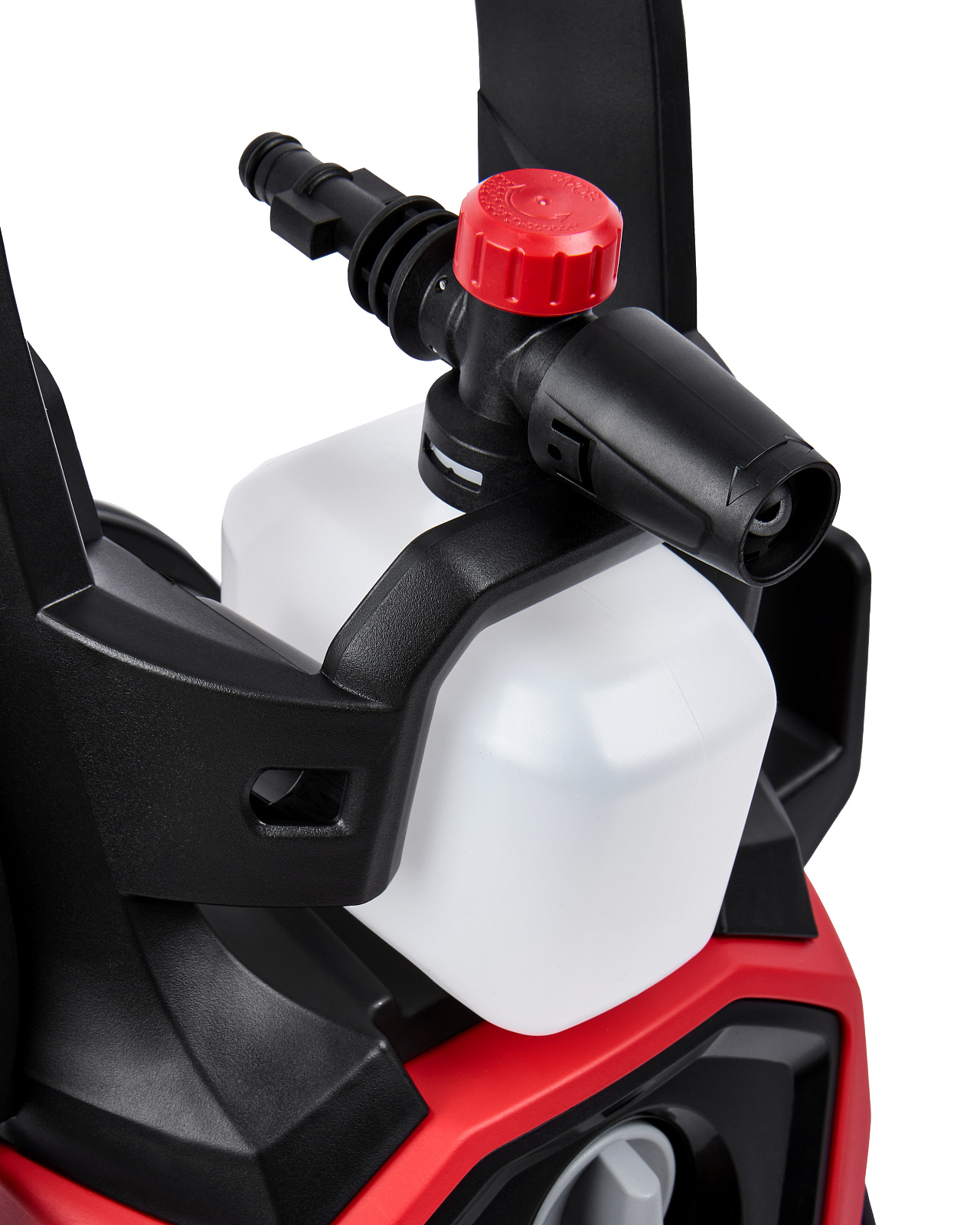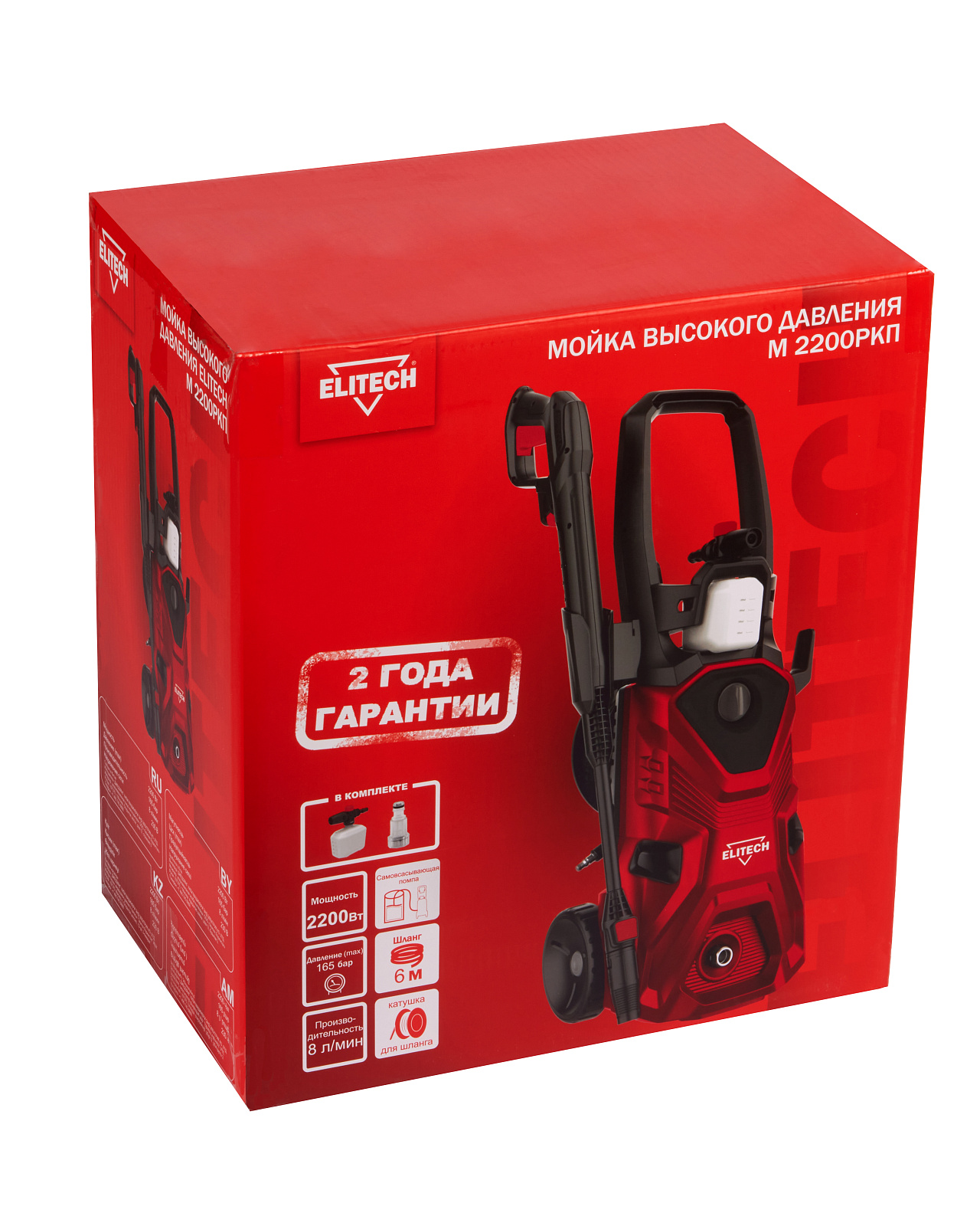 Мойка Elitech мощностью 2,2 кВт и рабочим давлением 110 бар является самовсасывающей и может осуществлять забор воды, как из водопровода, так и из отдельной ёмкости.