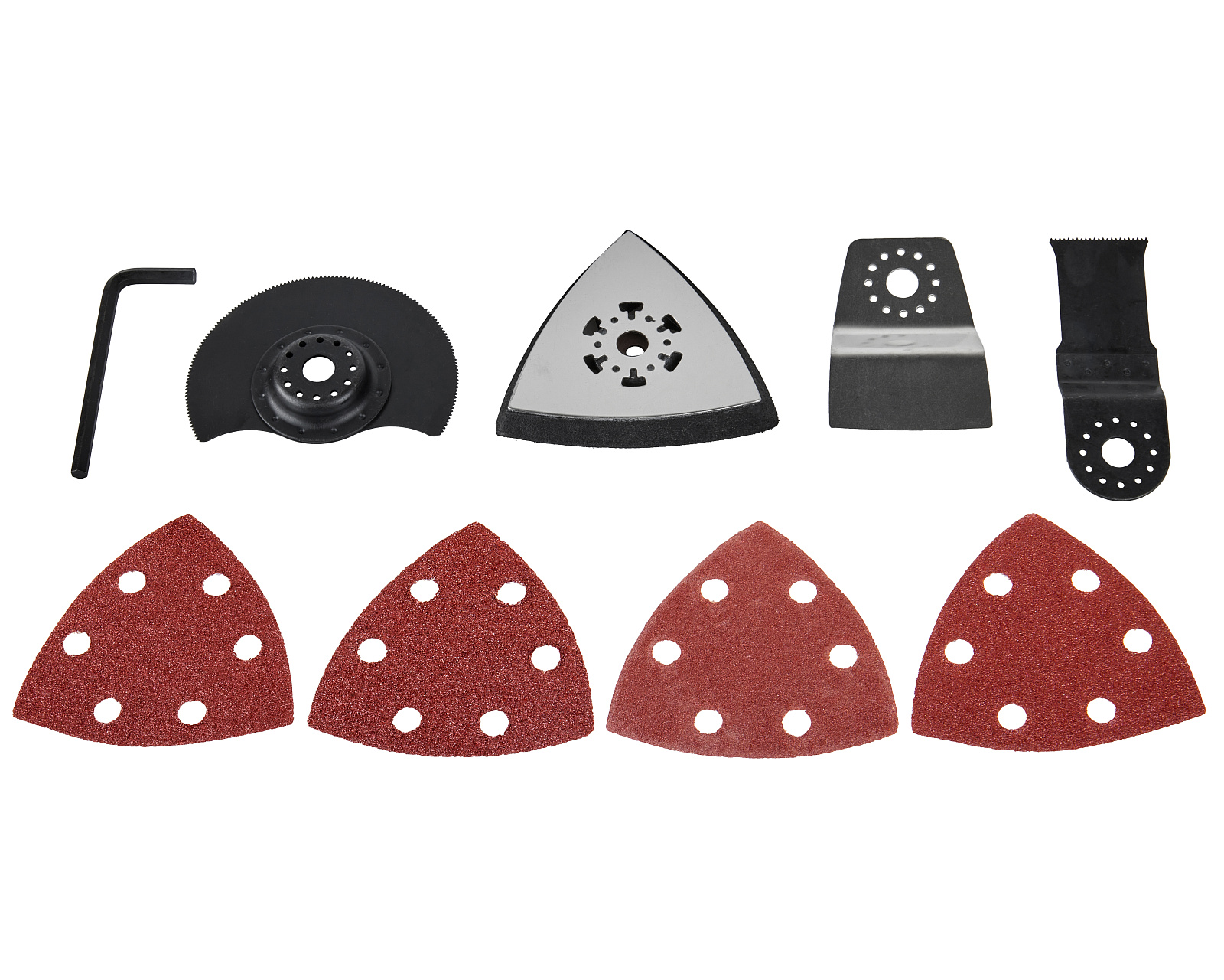 Многофункциональный инструмент или мультиинструмент, мощностью 350 Вт и частотой колебаний 15000-23000 кол/мин с амплитудой 3°, в зависимости от установленной насадки, предназначен для сухого шлифования небольших поверхностей, а также для пиления, шабрения, шлифования, полирования, соскабливания, резки и отделения материала от основы. Система крепления насадок мультиинструмента – OIS.
