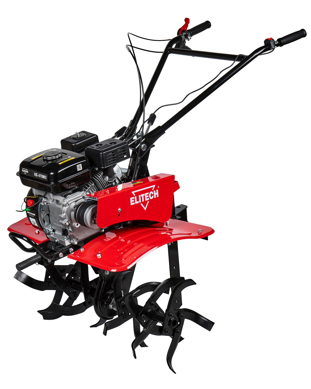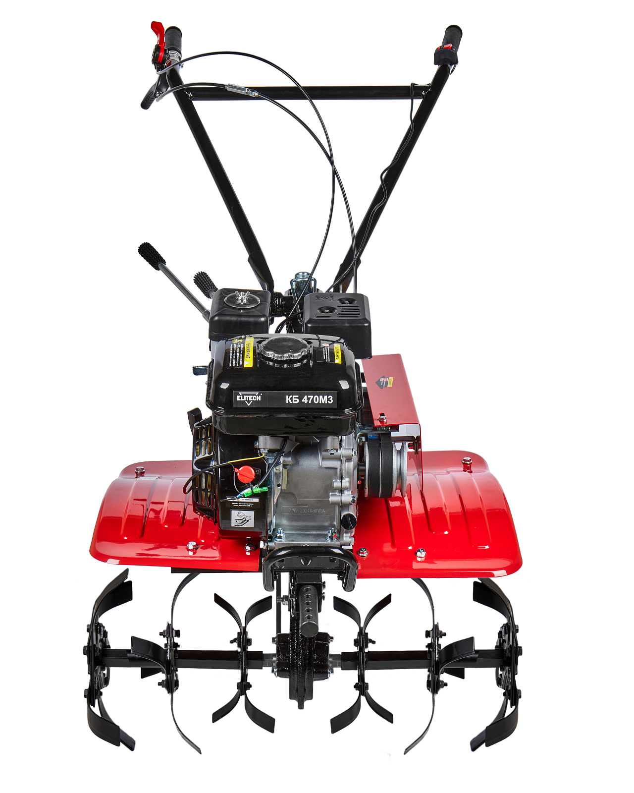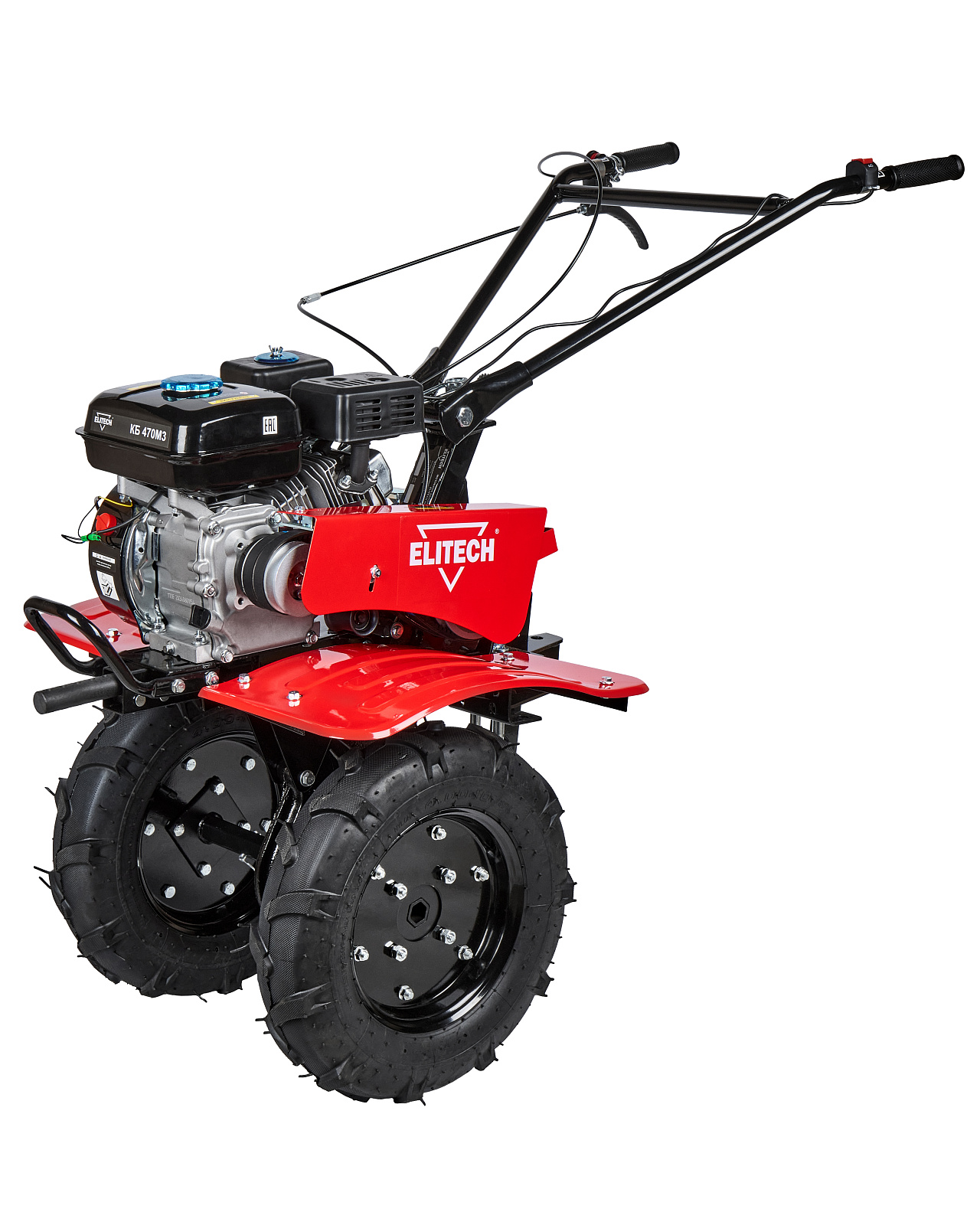 Мотоблок КБ 470М3 оснащен бензиновым 4-тактным двигателем мощностью 7 л.с. и коробкой передач 3 скорости вперед /1 назад. Поставляется в комплекте с пневматическими колесами. Мотоблок имеет задний фаркоп для крепления навесного оборудования (плуг, окучник, картофелевыкапыватель, прицепа-тележки). Для работы с данным навесным оборудованием необходимо дополнительно установить на мотоблок грунтозацепы. И передним валом для установки и работы с активным навесным оборудованием (роторная косилка, щетка и т.п.), приводимым в действие через шкив отбора мощности.
