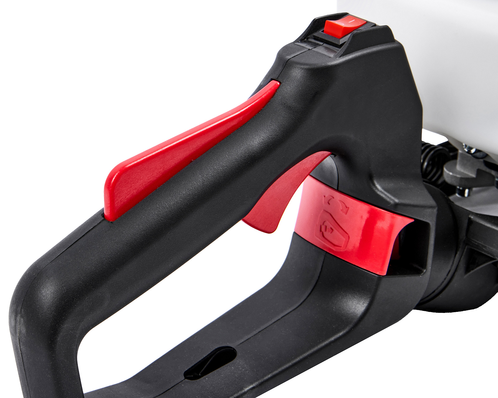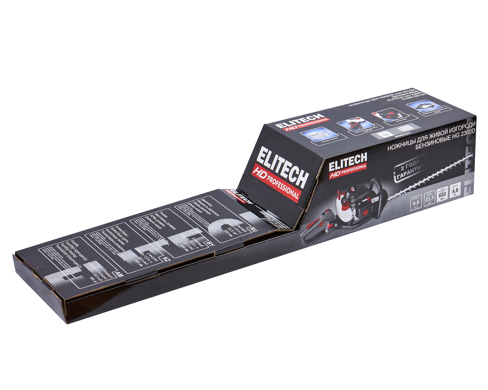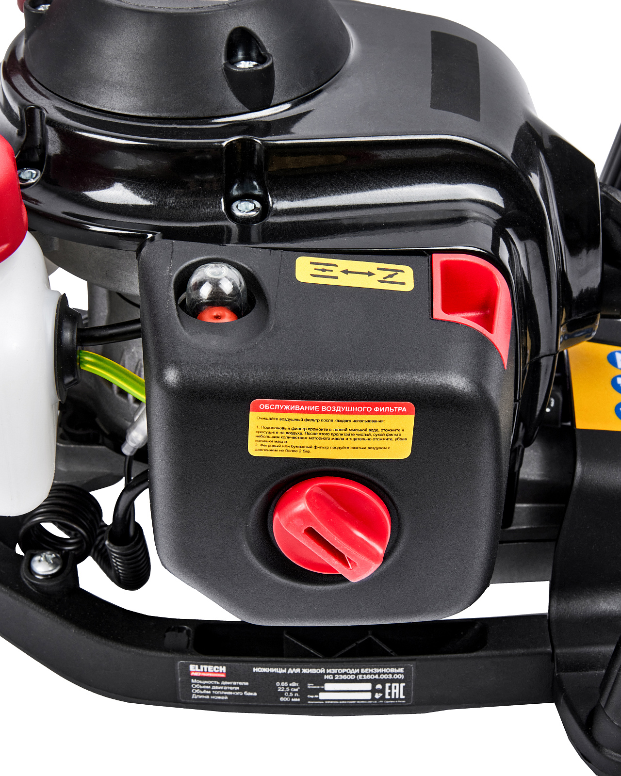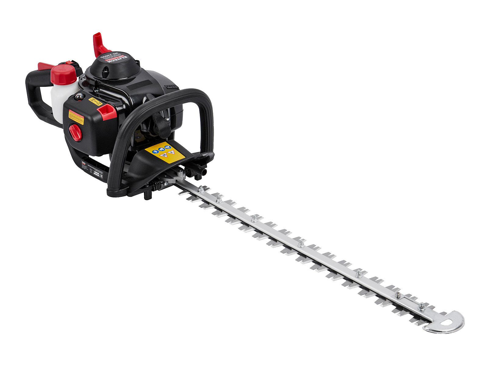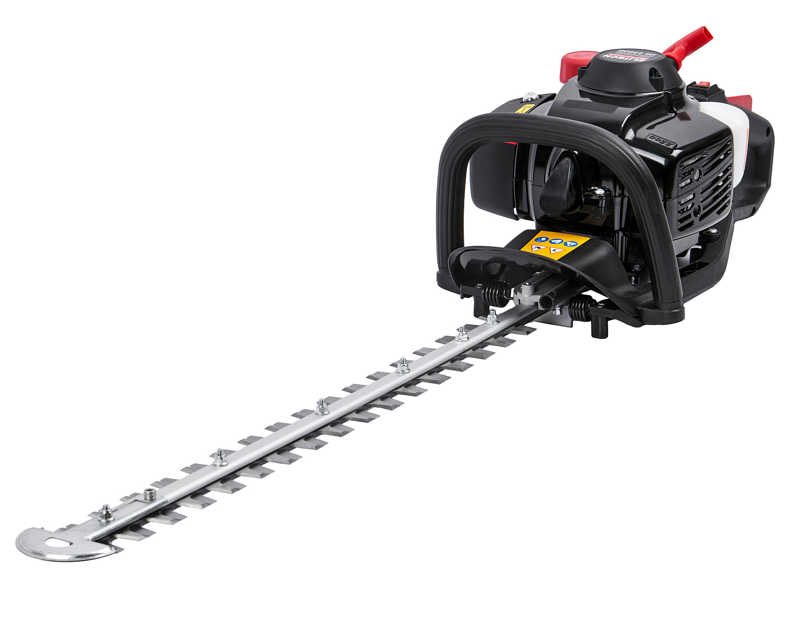 Бензиновые ножницы для живой изгороди мощностью 0,9 л.с. (0,65 кВт), эргономичной конструкции, с низкооборотистым двигателем современной конструкции, работающим на топливной смеси в пропорции 1:50, обеспечивающим высокий крутящий момент и длительный срок эксплуатации, с двухсторонними ножами длиной 600 мм, с лазерной заточкой и поворотной задней рукояткой (5 положений)