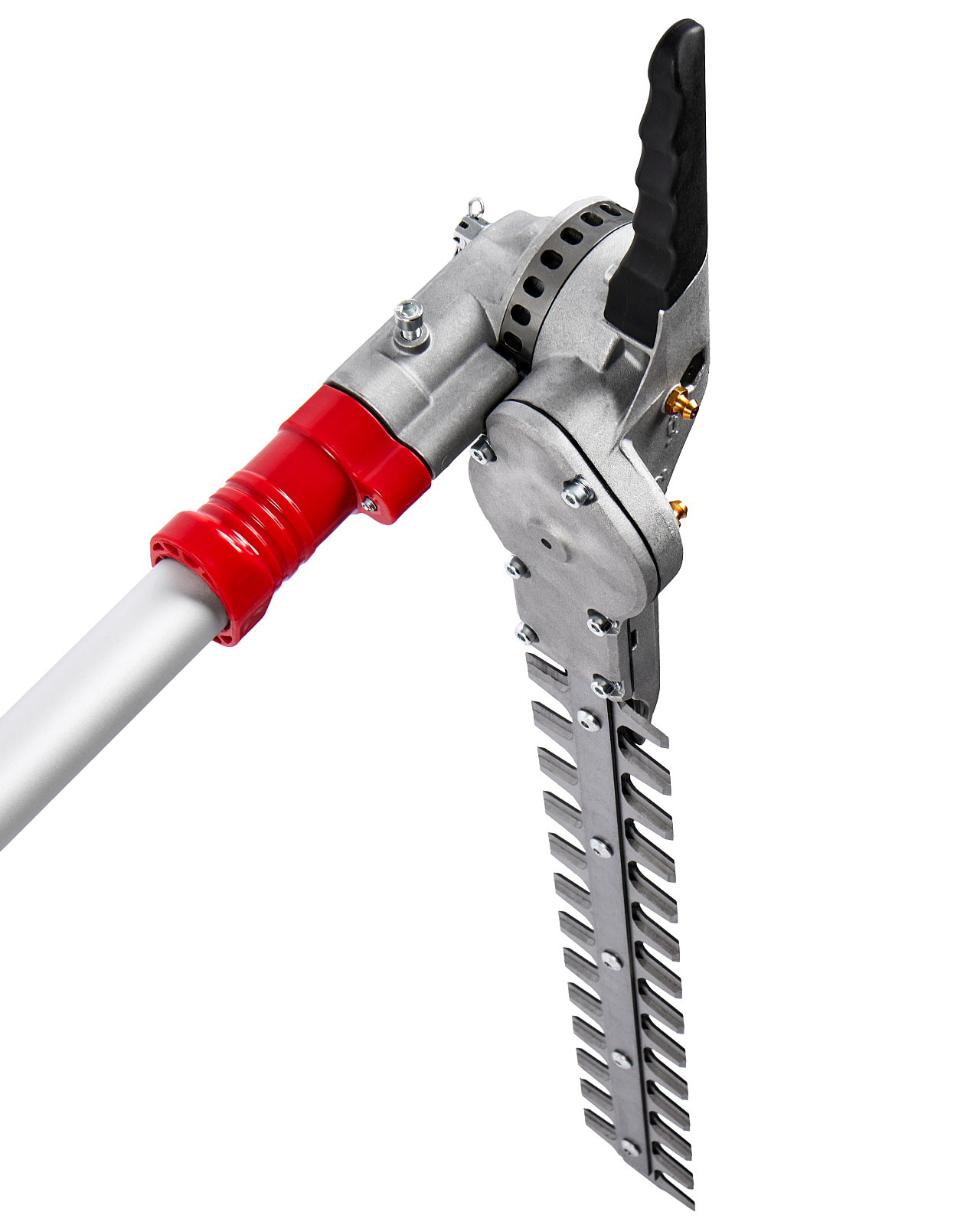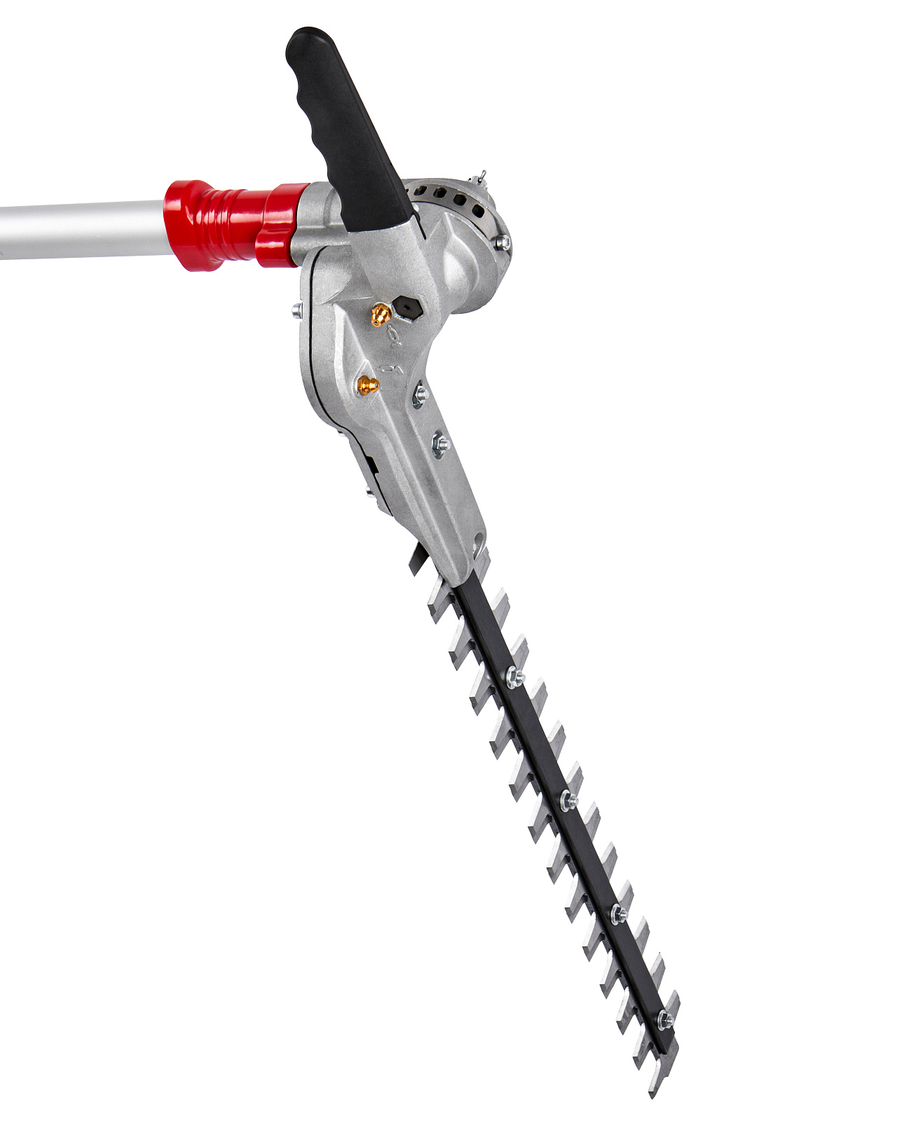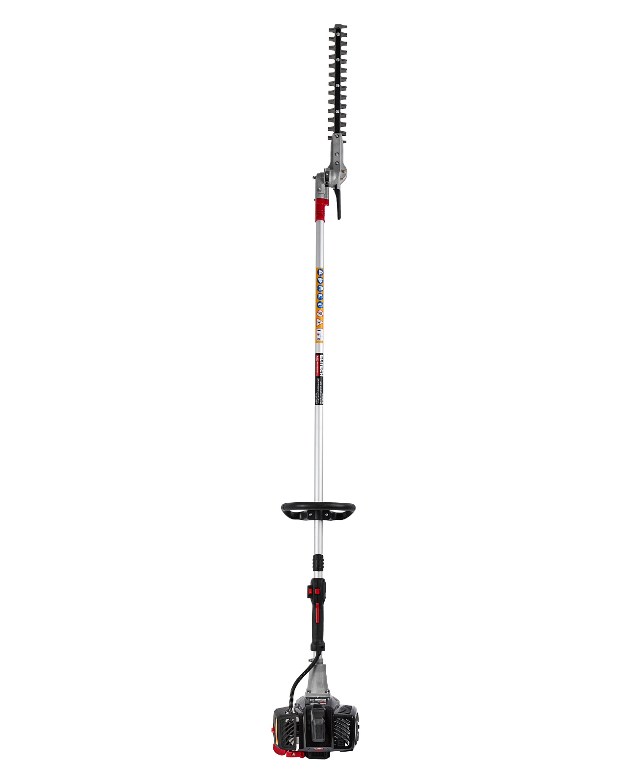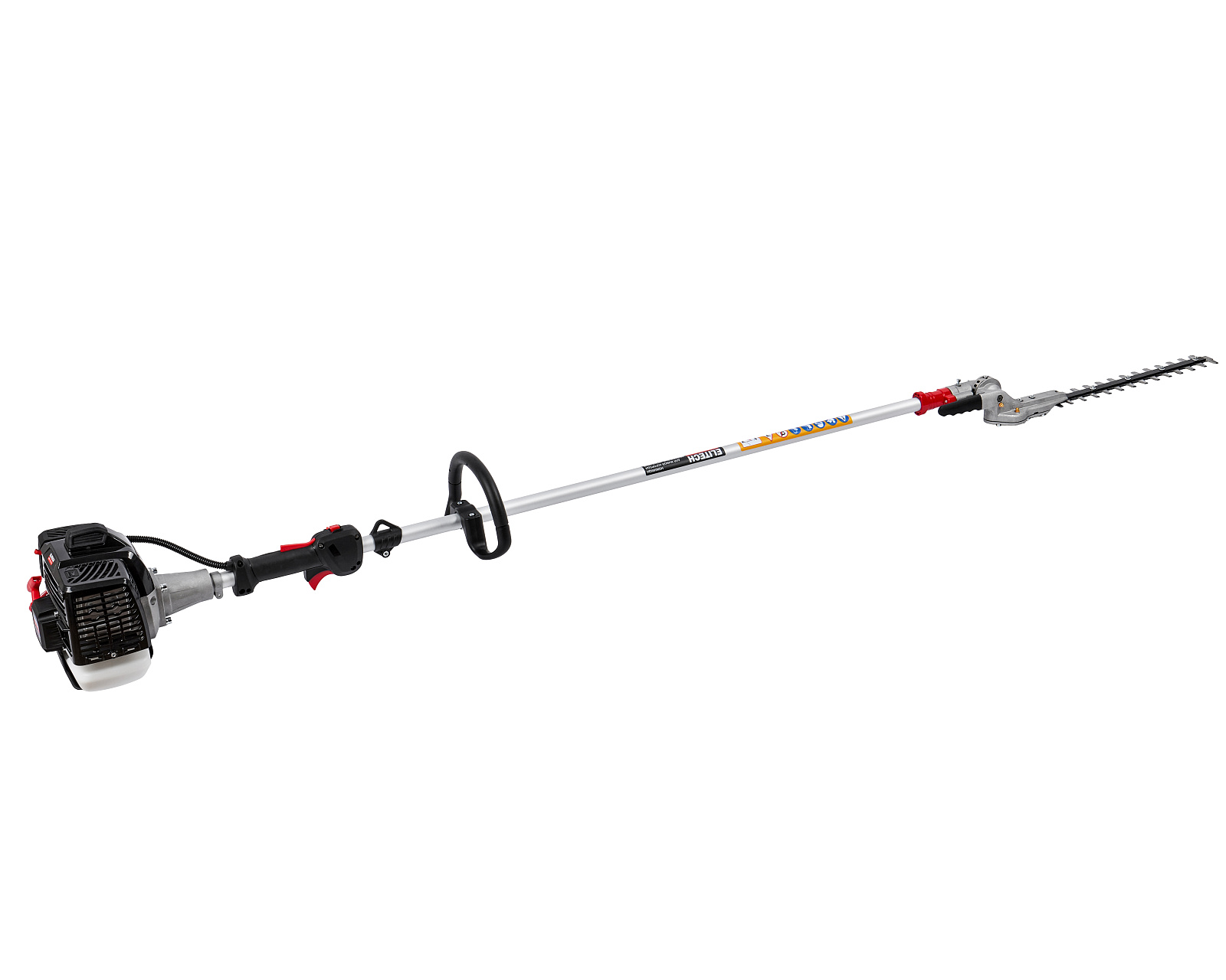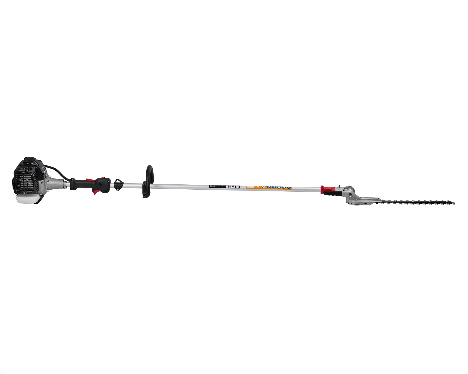 Бензиновые ножницы для живой изгороди мощностью 1,1 л.с. (0,8 кВт), с современным двигателем, работающим на топливной смеси в пропорции 1:50, с двухсторонними ножами с лазерной заточкой, длиной 368 мм, установленными на штанге длиной 1,5 м, с функцией поворота ножей в диапазоне 145 градусов