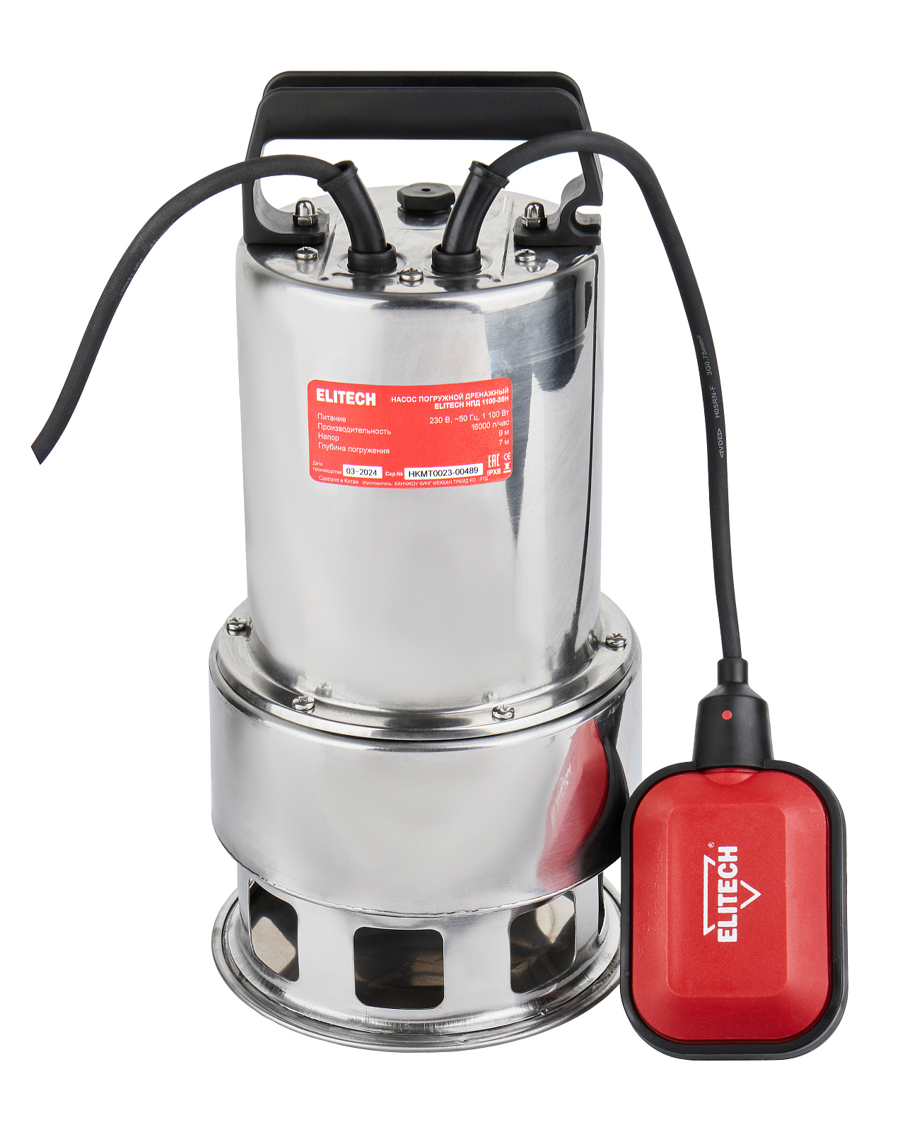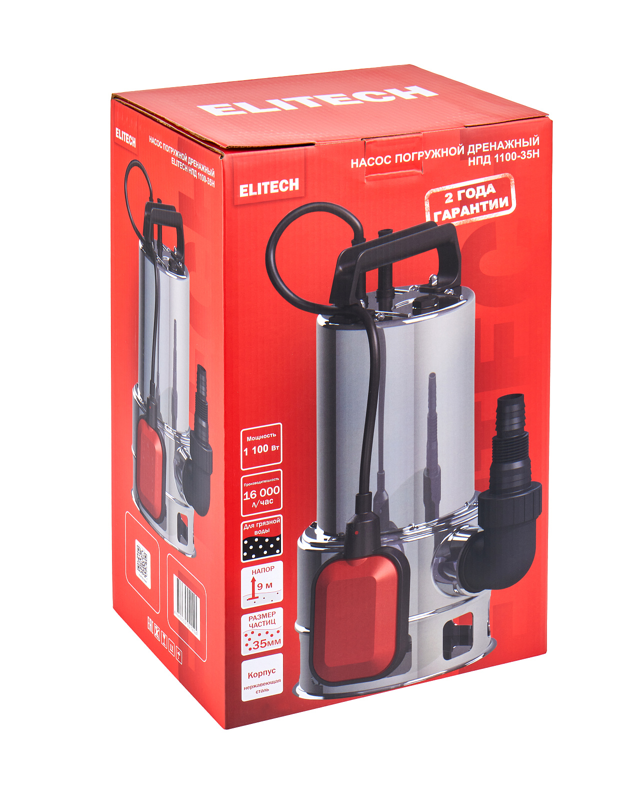 Погружной дренажный насос «ELITECH» мощностью 1100 Вт и производительностью 16 000 л/час предназначен для перекачивания загрязненной воды с диаметром твердых частиц не более 35 мм из колодцев, открытых водоемов, затапливаемых подвалов и других источников.