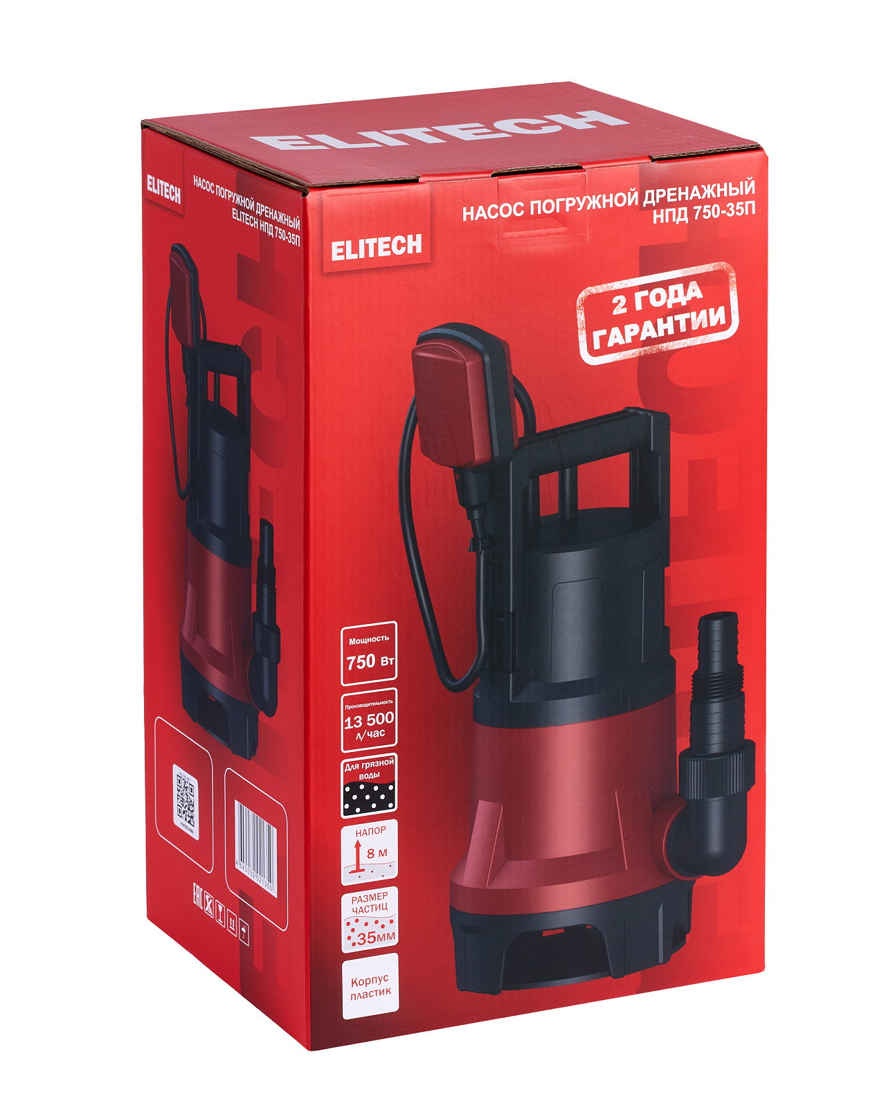 Погружной дренажный насос «ELITECH» мощностью 750 Вт и производительностью 13 500 л/час предназначен для перекачивания загрязненной воды с диаметром твердых частиц не более 35 мм из колодцев, открытых водоемов, затапливаемых подвалов и других источников.