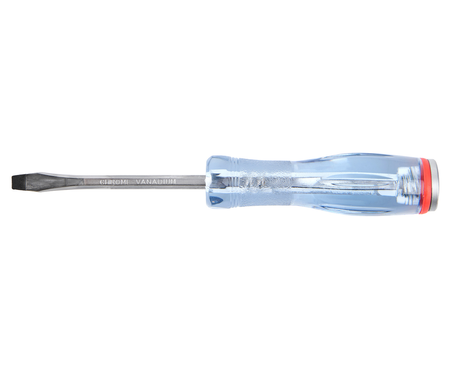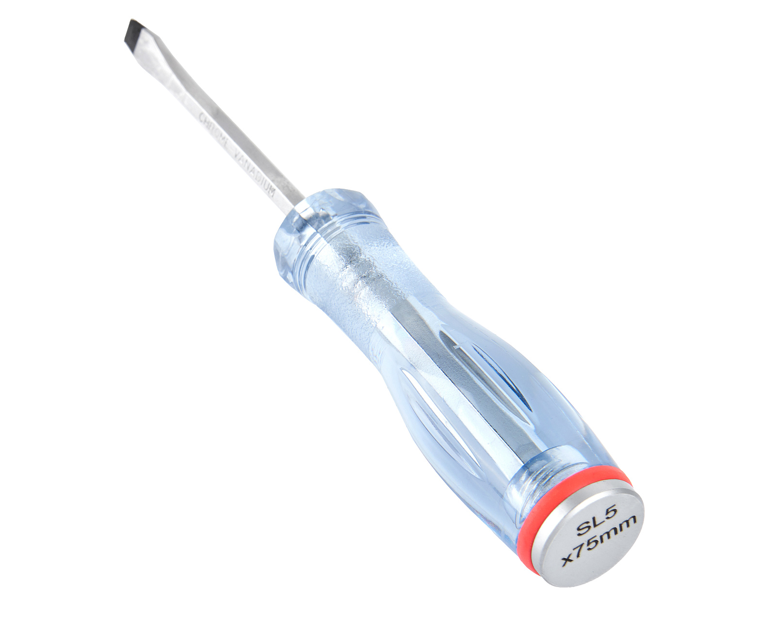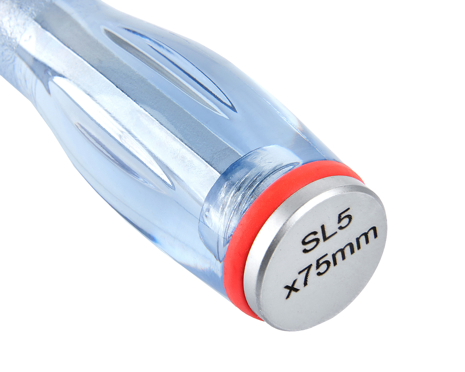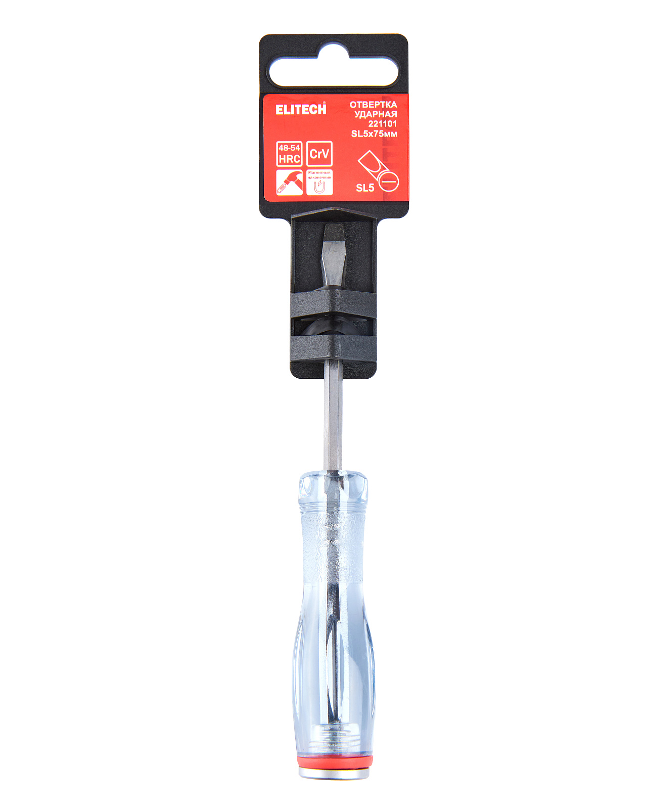 Отвертка ударная с плоским шлицом SL5,0х75мм, шестигранным стержнем из хромованадиевой стали с магнитным наконечником и съемным подпятником на резьбе.
