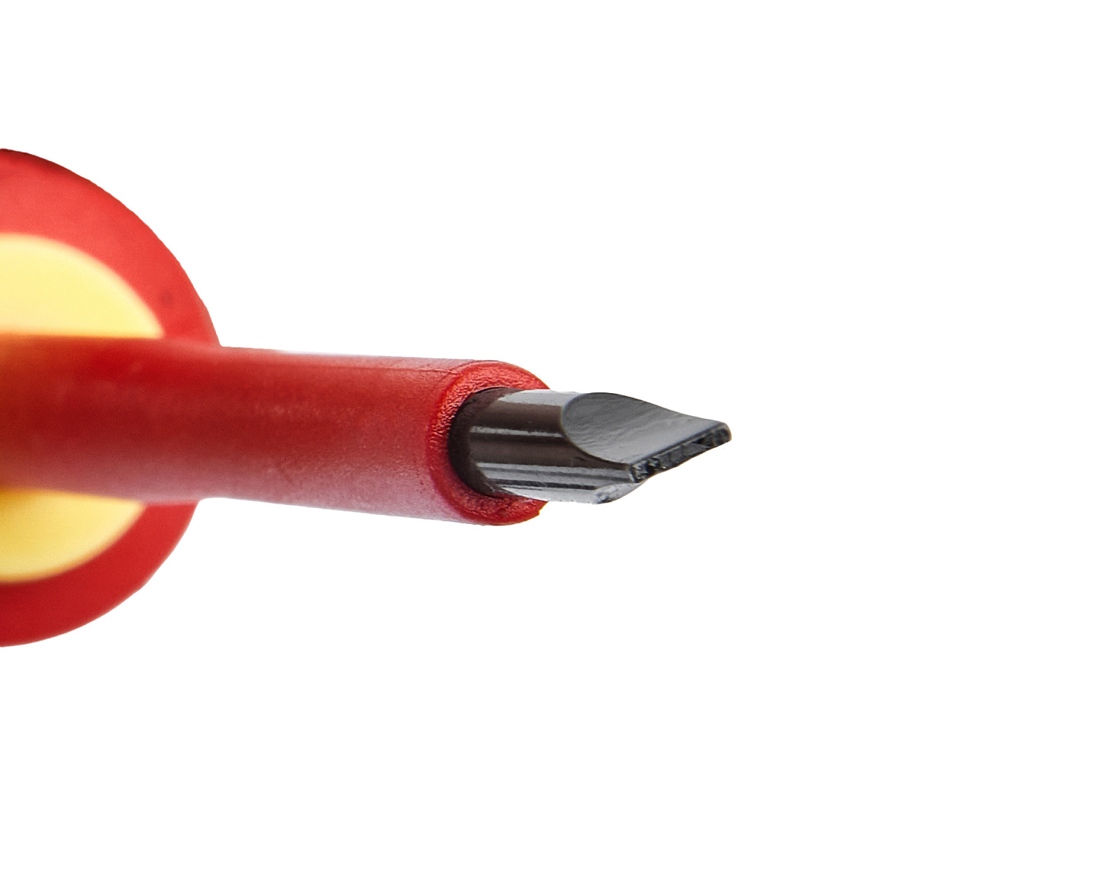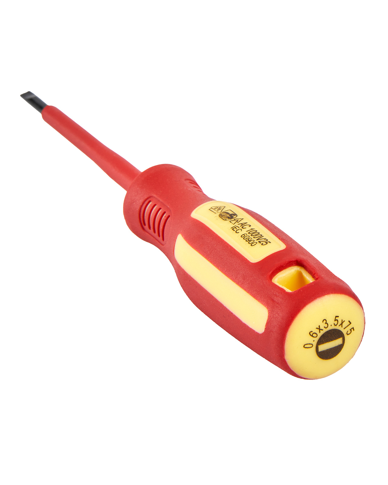 Отвертка диэлектрическая SL3,5x75мм. Наконечник отвертки намагниченный и имеет плоскую форму шлица (SL) шириной 3,5 мм. Длина рабочей части стержня 75 мм. Стержень выполнен из стали S2, которая обладает высокой прочностью и твердостью. Отвертка имеет диэлектрическую ручку и диэлектрическое покрытие стержня, которое выдерживает напряжение до 1000В переменного тока.