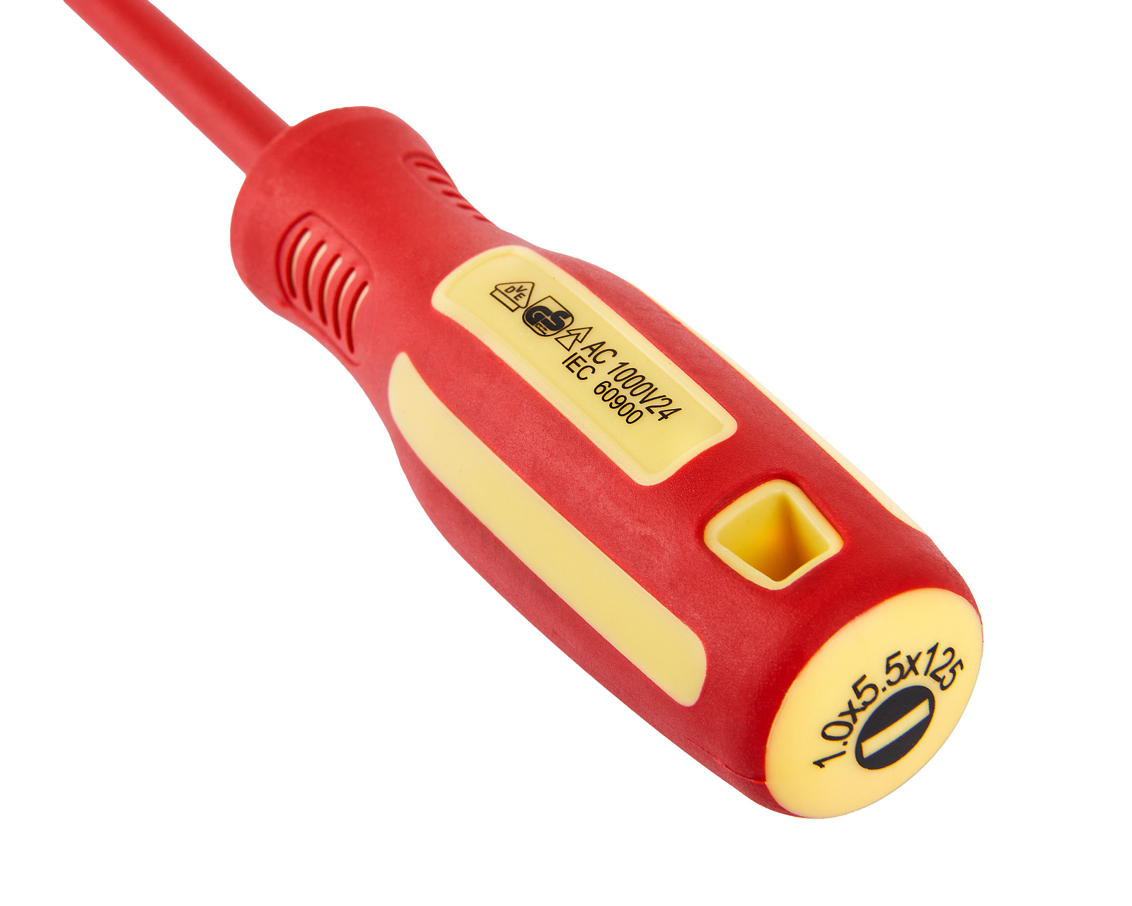 Отвертка диэлектрическая SL5,5x125мм. Наконечник отвертки намагниченный и имеет плоскую форму шлица (SL) шириной 5,5 мм. Длина рабочей части стержня 125 мм. Стержень выполнен из стали S2, которая обладает высокой прочностью и твердостью. Отвертка имеет диэлектрическую ручку и диэлектрическое покрытие стержня, которое выдерживает напряжение до 1000В переменного тока.