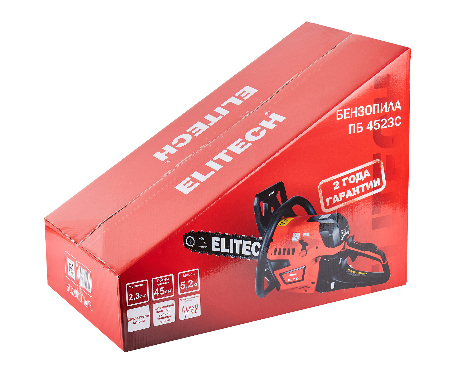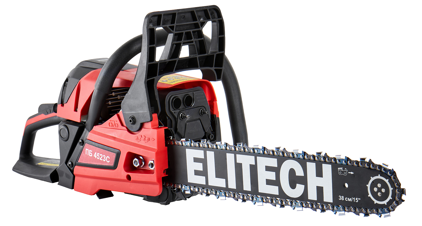 Бензиновая цепная пила Elitech ПБ 4523С мощностью 2,3 л.с. и с шиной длиной 38 см, предназначена для пиления древесины вне помещений, на открытом воздухе, для валки деревьев, обрезки веток и сучьев, раскряжевки ствола на сортименты и заготовки дров. Может применяться для плотницких работ, расчистки местности от кустарников и молодой поросли деревьев, и других хозяйственных работ, связанных с пилением древесины.Преимущества