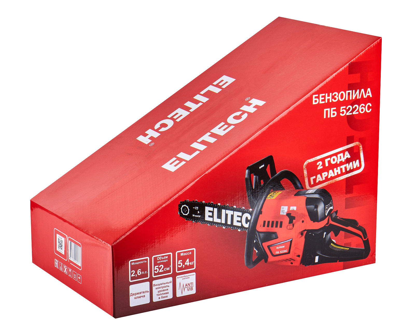 Бензиновая цепная пила Elitech ПБ 5226С мощностью 2,6 л.с. и с шиной длиной 38 см, предназначена для пиления древесины вне помещений, на открытом воздухе, для валки деревьев, обрезки веток и сучьев, раскряжевки ствола на сортименты и заготовки дров. Может применяться для плотницких работ, расчистки местности от кустарников и молодой поросли деревьев, и других хозяйственных работ, связанных с пилением древесины.Преимущества