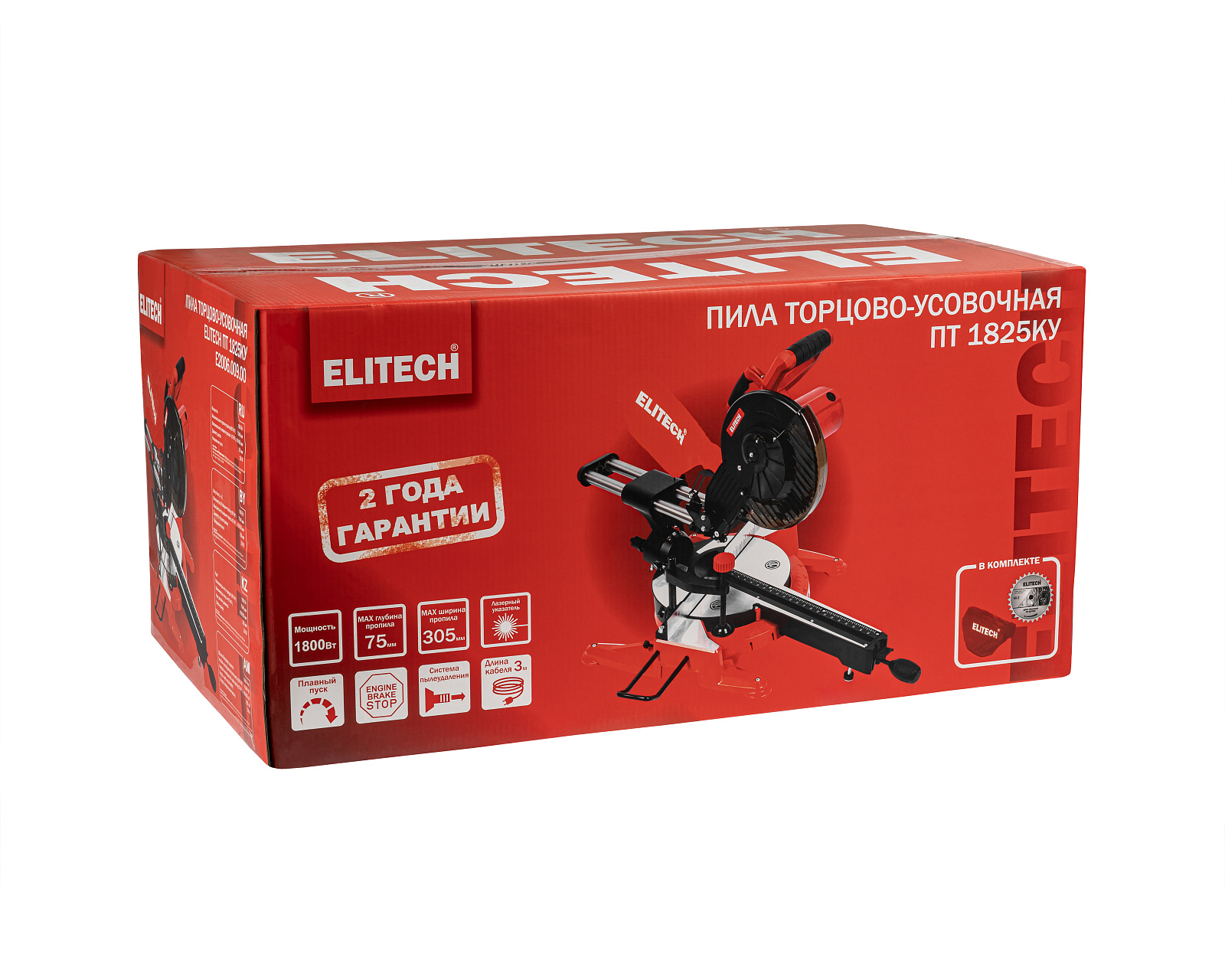 Торцовочно-усовочная пила ПТ 1825КУ (E2006.009.00) с электродвигателем мощностью 1800 Вт и скоростью вращения 4800 об/мин, предназначена для стационарной и точной распиловки дерева и производных от него материалов любой длины и любой формы под заданным углом распила. Пила подключается к однофазной сети переменного тока напряжением 230 В и частотой 50 Гц и рассчитана для работы диском с макс.диаметром 255 мм.