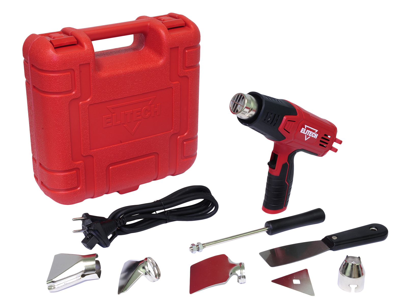 Термопистолет (технический фен) ELITECH ТВ 1600 используется при следующих видах работ : снятие лакокрасочных покрытий с деревянных поверхностей, пайка, сварка и формовка пластика, осаживание термоусадочных материалов, ускорение процессов склеивания, пайка мягким припоем и лужение, сушка и размораживание, сварка и резка листовых и рулонных материалов (линолеума и подобных). Инструмент имеет два режима работы : с температурой 400 градусов (расход воздуха 250 л/мин) и 590 градусов (550 л/мин). Есть защита от перегрева и принудительное охлаждение при выключение. Длина сетевого кабеля 2 метра. Комплектация : понижающее сопло, плоское сопло, стеклозащитное сопло, рефлекторное сопло, скребок, шпатель, кейс, руководство по эксплуатации.