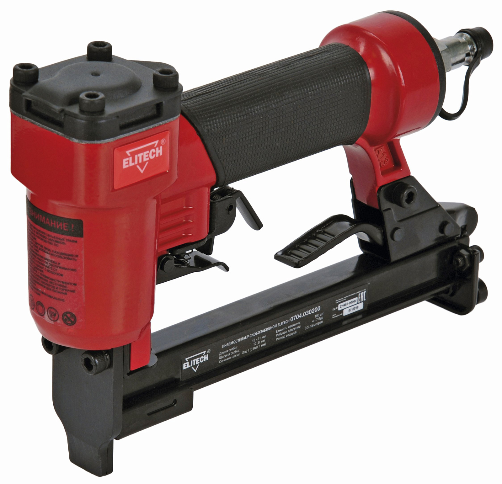 Пневмостеплер скобозабивной 0704.030200 для работы использует сжатый воздух от компрессора давлением от 4 до 7 бар. Степлер используется для крепления гипсокартона, утеплителя, фанеры и прочего. В качестве оснастки применяются скобы размером 6-16 мм. Вместимость магазина составляет 100 штук. Скобы - тип 80.