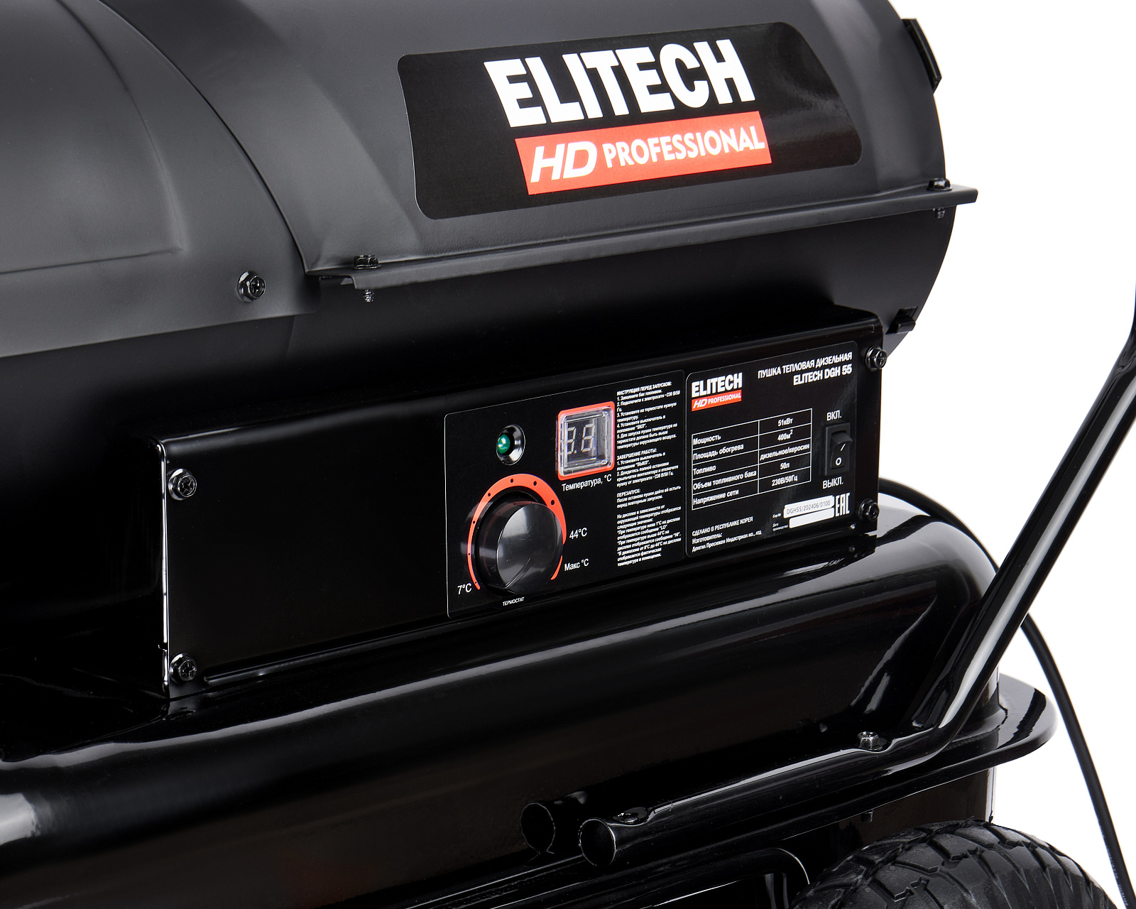 Дизельная тепловая пушка прямого нагрева (или воздухонагреватель) мощностью 51 кВт и площадью обогрева 400 кв.м и топливным баком на 50 литров, предназначена для работы на открытых/полузакрытых площадках и временного обогрева/просушки хорошо проветриваемых помещений или с работающей приточно-вытяжной вентиляцией.