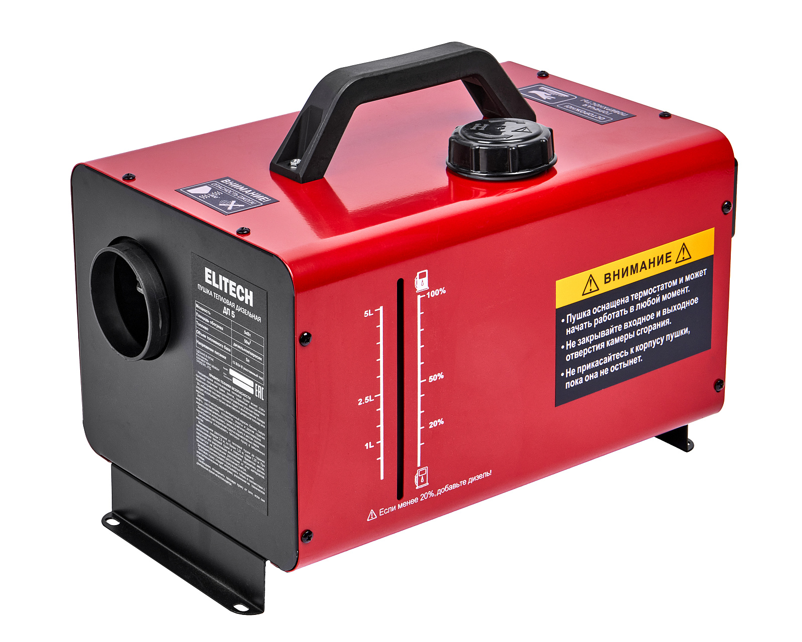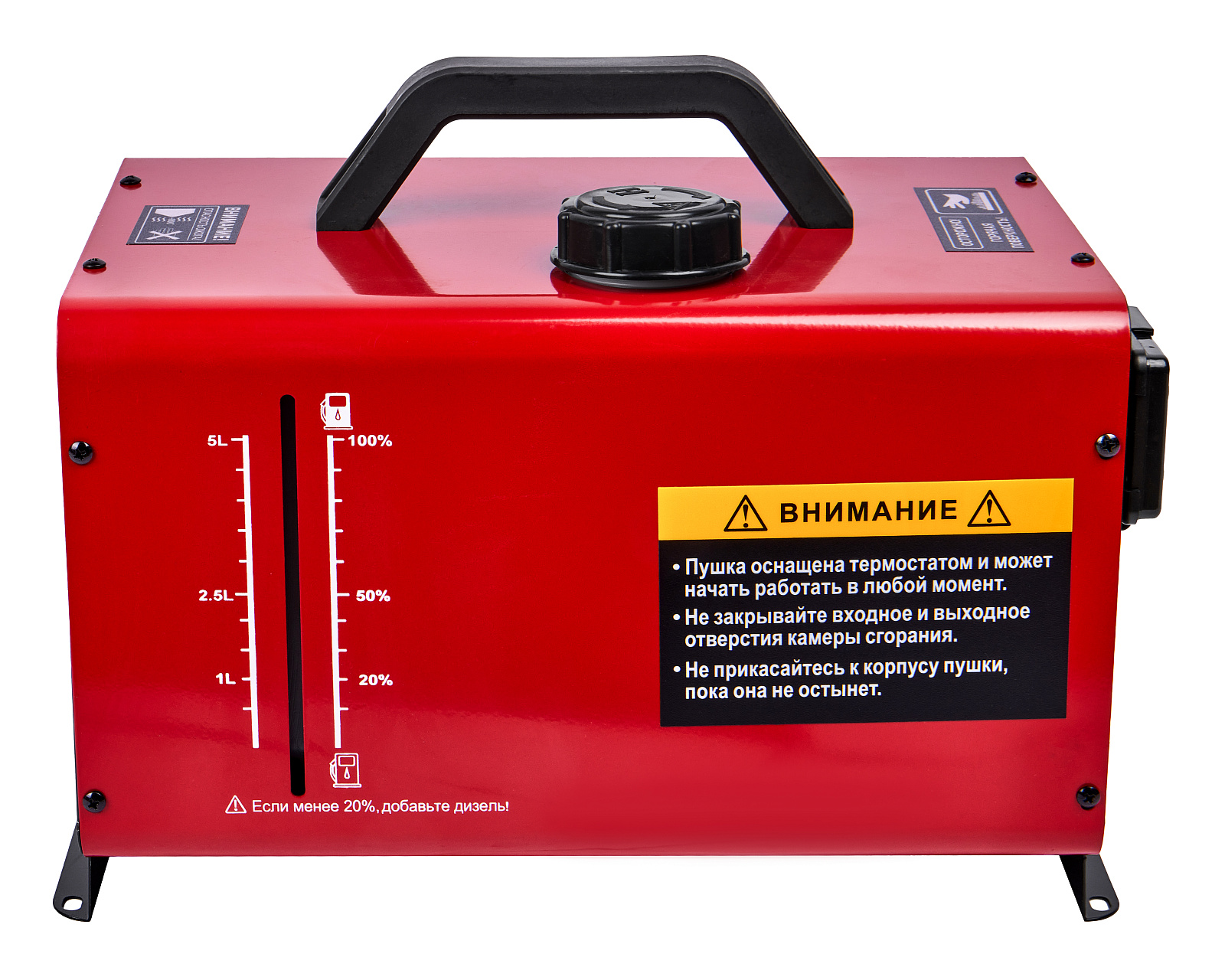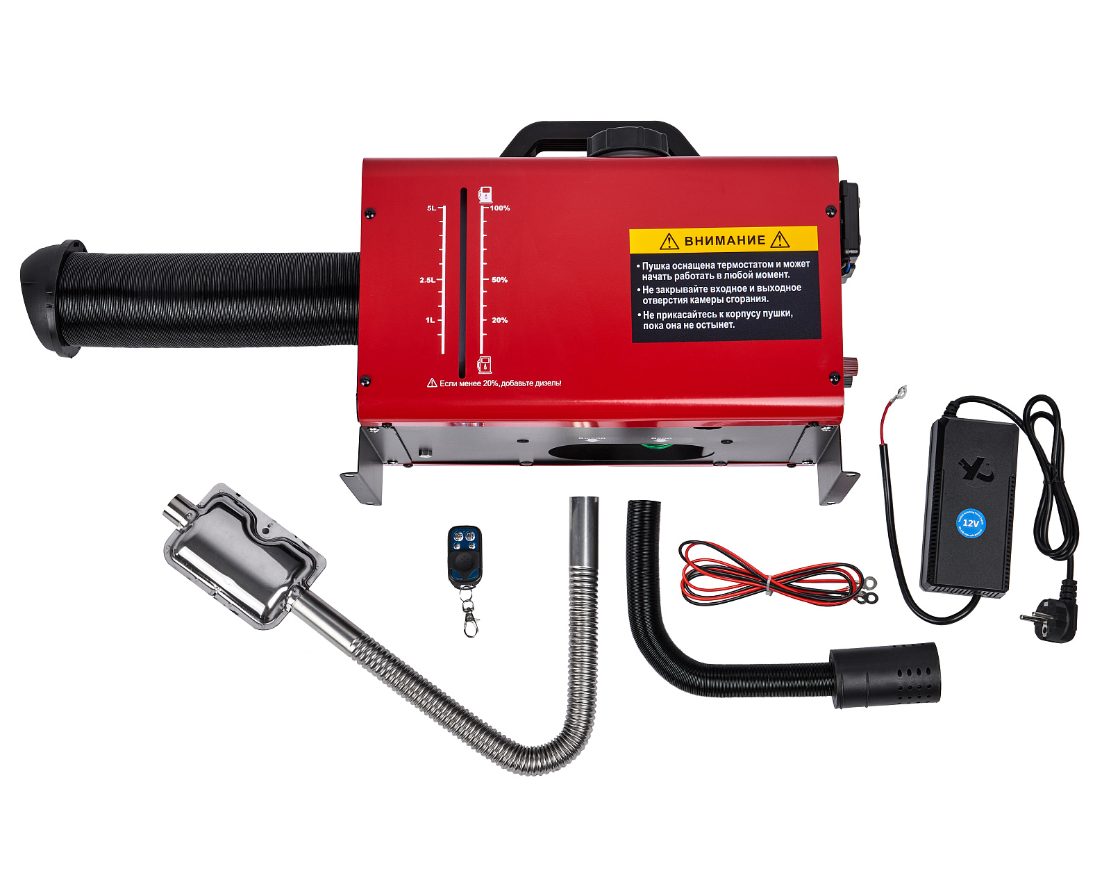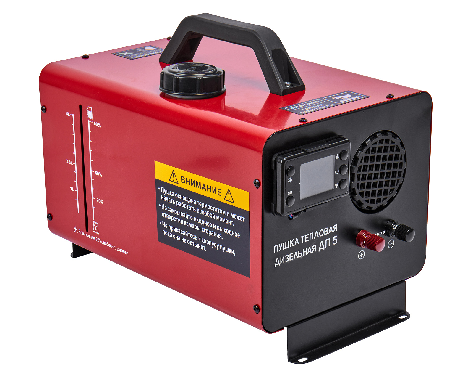 Дизельная тепловая пушка (или воздухонагреватель) непрямого нагрева мощностью 5 кВт, производительностью 190 куб.м/час, напряжением питания от +12 до +24 В, предназначена для работы на открытых/полузакрытых площадках и временного обогрева/просушки хорошо проветриваемых помещений или с работающей приточно-вытяжной вентиляцией.