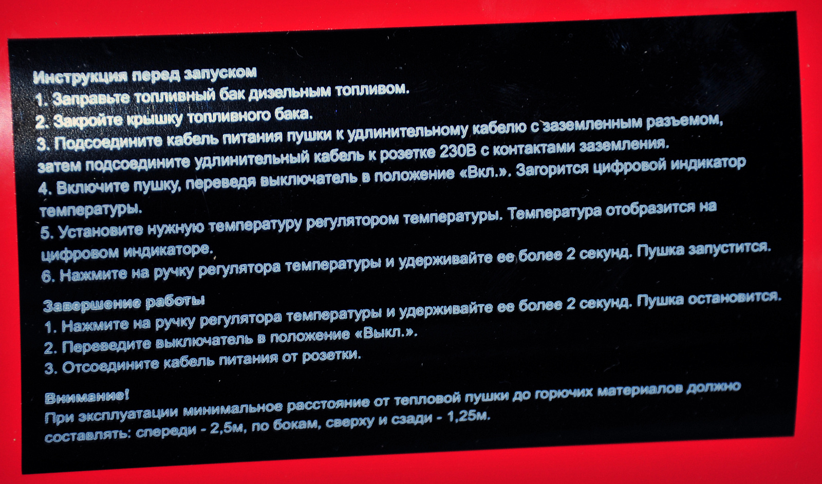 Дизельная тепловая пушка предназначена для обогрева полузакрытых площадок и временного обогрева/просушки хорошо проветриваемых помещений.Запрещено использовать дизельную тепловую пушку в жилых помещениях и в помещениях с плохой вентиляцией.