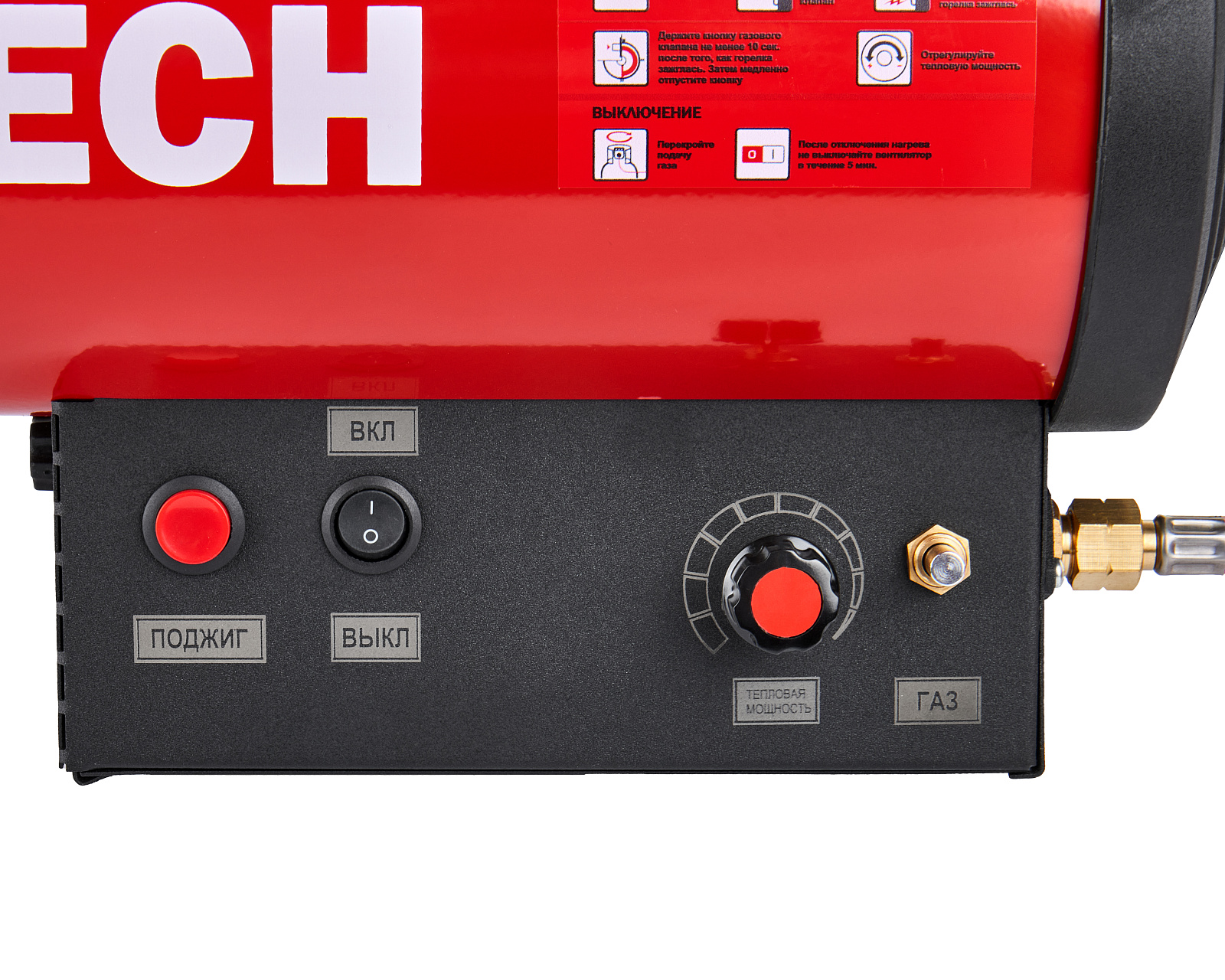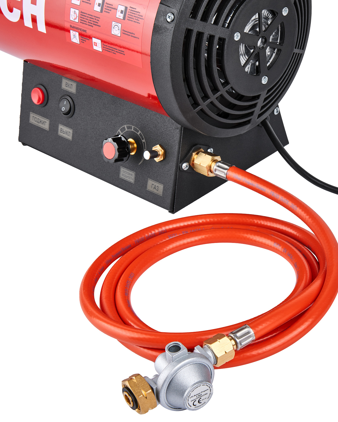 Пушка оснащена защитой от затухания пламени. Когда пламя горелки тухнет, автоматический клапан перекрывает подачу газа.