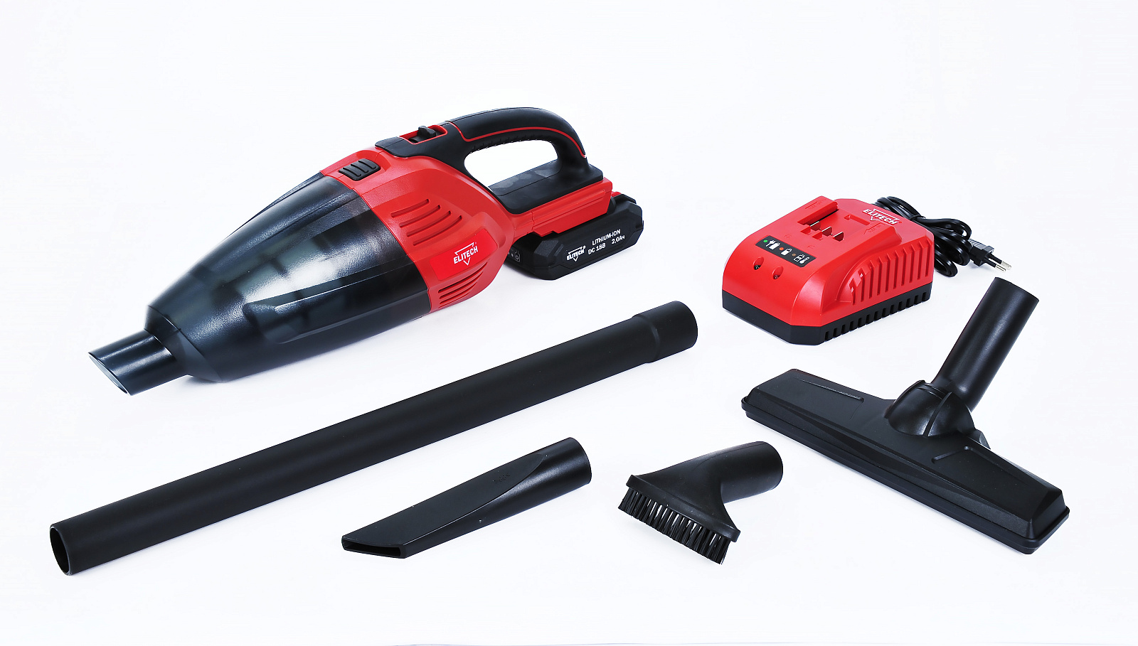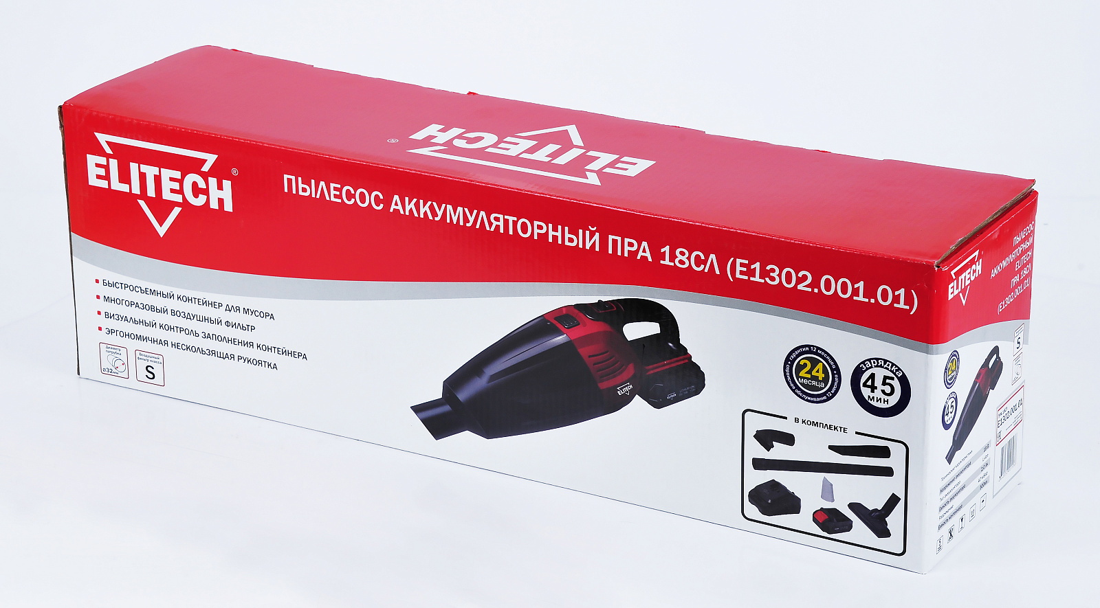 Пылесос аккумуляторный ELITECH ПРА 18СЛ (Е1302.001.02) предназначен для сбора бытовой пыли и мусора, уборки помещений, салона автомобиля, чистки мягкой мебели. В качестве источника питания используется аккумулятор напряжением 18 В. В пылесосе установлен HEPA фильтр (гофрированный многоразовый, из полиэстера, не боится влаги, можно мыть). При отсоединение контейнера для пыли от корпуса пылесоса фильтр полностью перекрывает отверстие контейнера и не дает возможности случайно рассыпать его содержимое. В комплекте три насадки для уборки и удлинительная трубка.