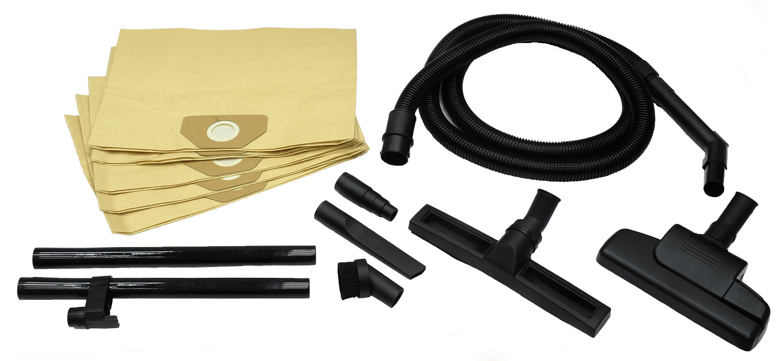 Шланг гофрированный 3м - 1шт, труба - 2шт, универсальная насадка для сухой уборки - 1шт, насадка для влажной уборки - 1шт, щелевая насадка - 1шт, насадка для мебели - 1шт, переходник ступенчатый (наружный диаметр 26,33,36,40мм, внутренний диаметр 22мм), основной картридж-фильтр - 1шт, мешок пылесборный бумажный - 5шт.