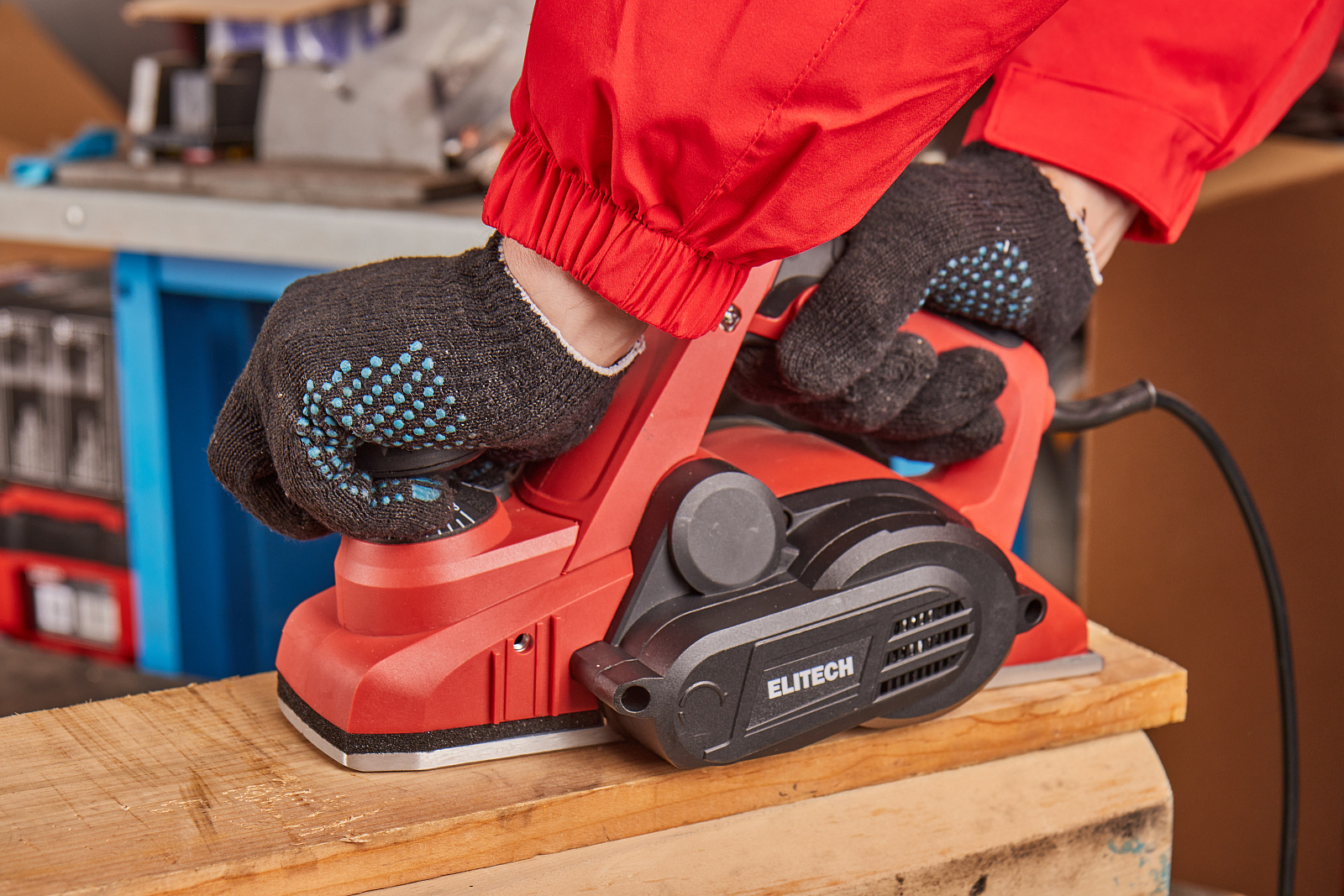 Патрубок для подключения пылесоса обеспечивает сбор стружки в пылесос или выброс в сторону. Плавная регулировка глубины строгания осуществляется путем поворота опорной ручки. V-образный паз в подошве обеспечивает легкое снятие фасок. Кнопка блокировки от случайного включения делает работу оператора безопасной.