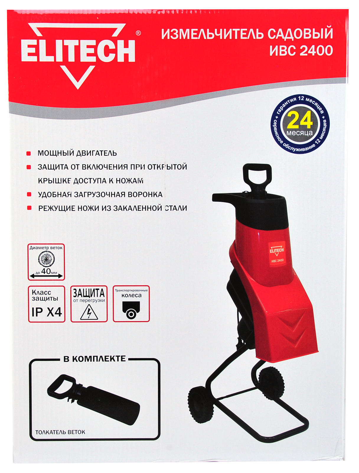 Измельчитель садовый ELITECH ИВС 2400 предназначен для измельчения в мульчу (мелкую фракцию) веток и сучьев садовых деревьев, а также стволов молодых деревьев толщиной не более 40 мм. Ветки загружаются в загрузочную горловину, измельчаются ножами и выбрасываются в виде мульчи на землю или в заранее подготовленную емкость. Полученная мульча может быть использована для мульчирования, в качестве сырья для компоста или утилизироваться. Мощный двигатель имеет защиту от перегрузки. Верхняя крышка с загрузочной воронкой может быть откинута в сторону для получению доступа к ножам и их очистки. В таком положение есть защита от включения при открытой крышке. Для подачи мелких обрезков (короче длины загрузочной воронки) используется толкатель, входящий в комплект поставки. Режущие ножи выполнены из закаленной стали. Для удобства перемещения измельчитель имеет подставку с транспортировочными колесами. Комплект поставки : подставка с колесами, толкатель.