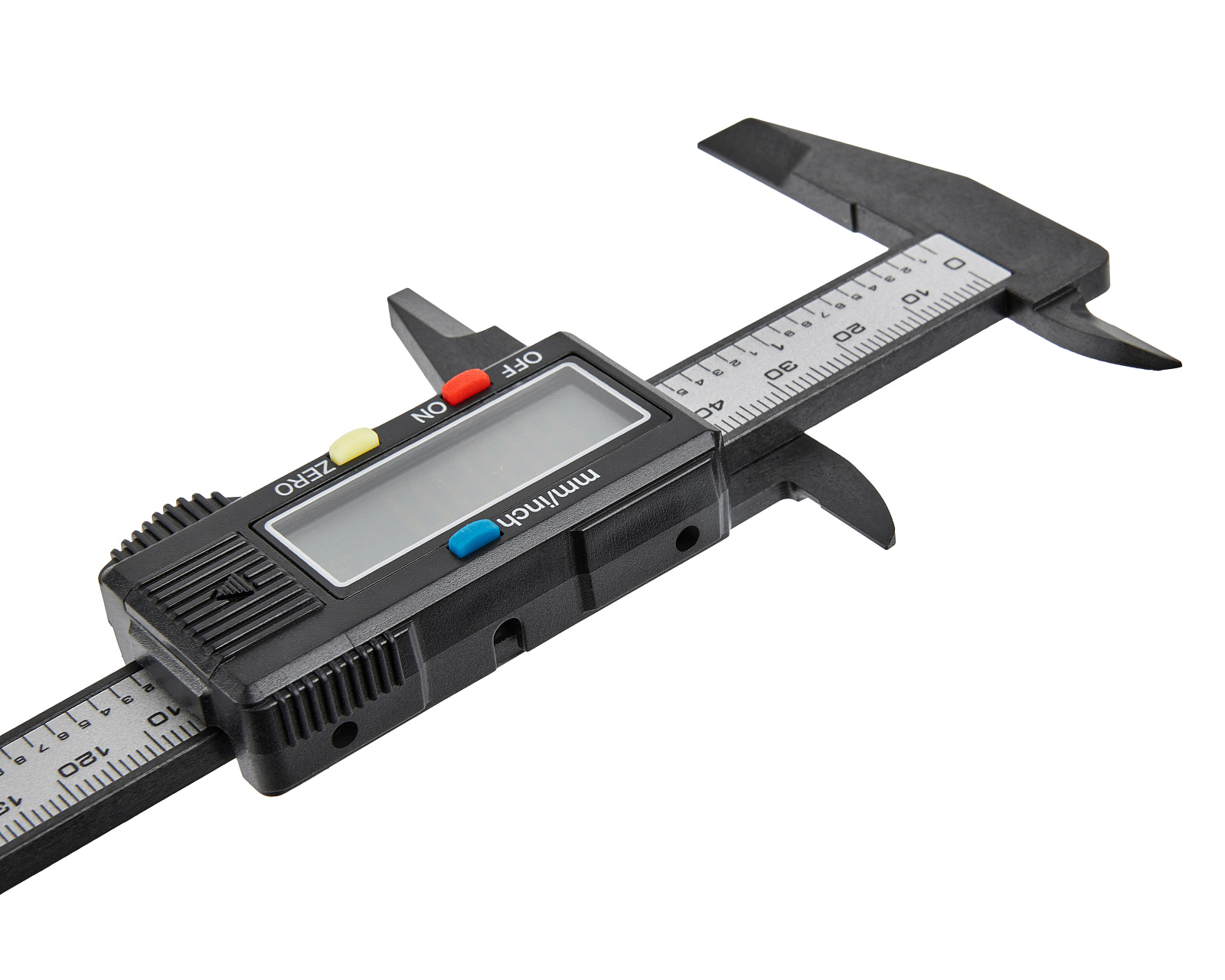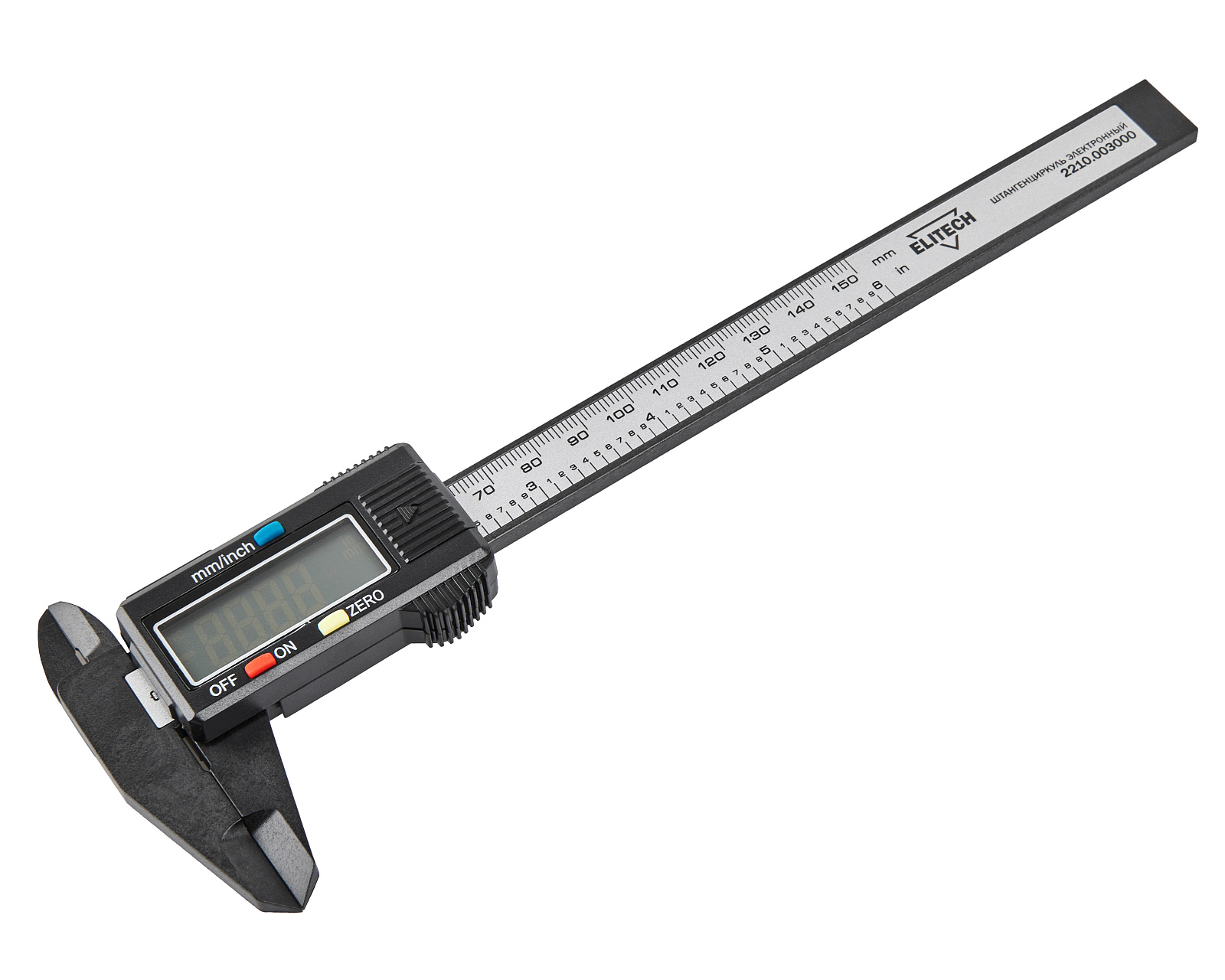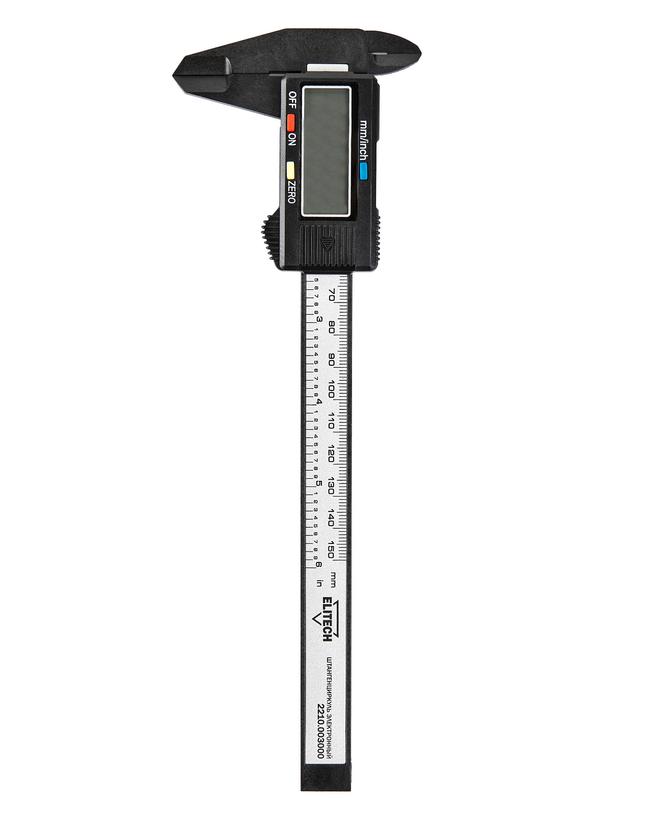 Штангенциркуль с цифровым дисплеем. Пластиковые губки. Выбор единицы измерения (дюймы или миллиметры). Измеряет внутренние и наружные диаметры, глубину отверстий и пазов.