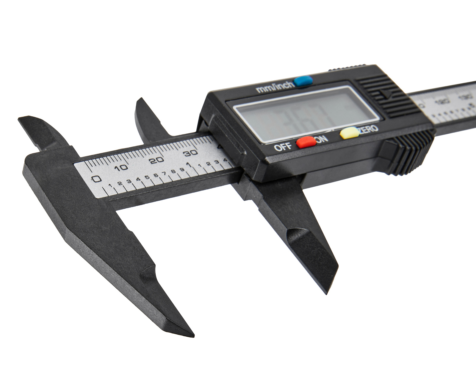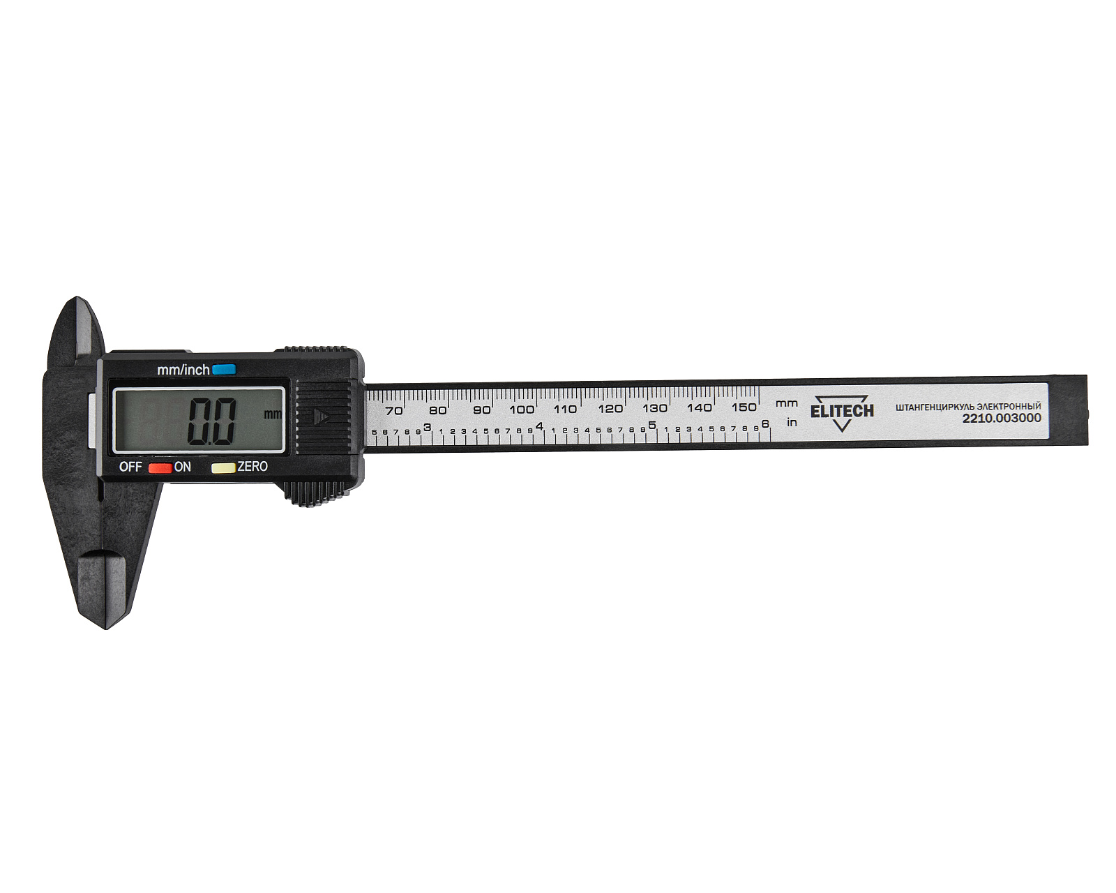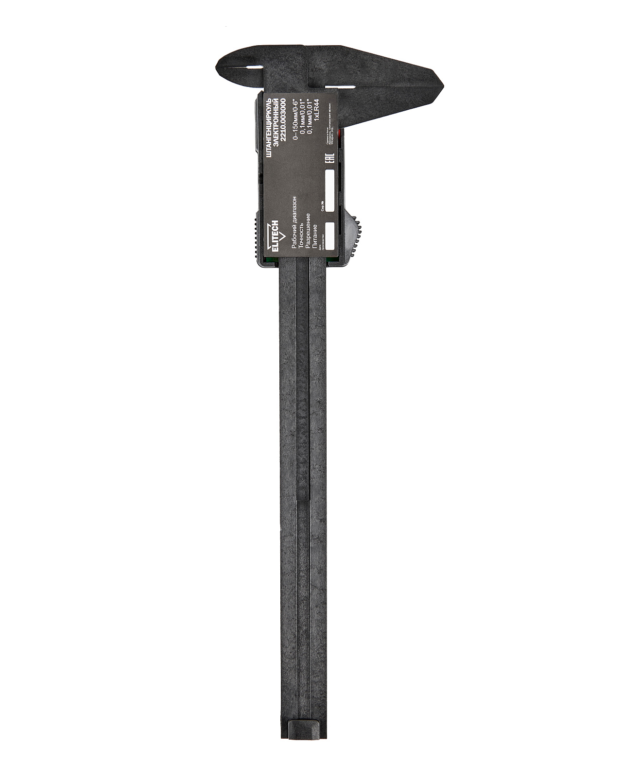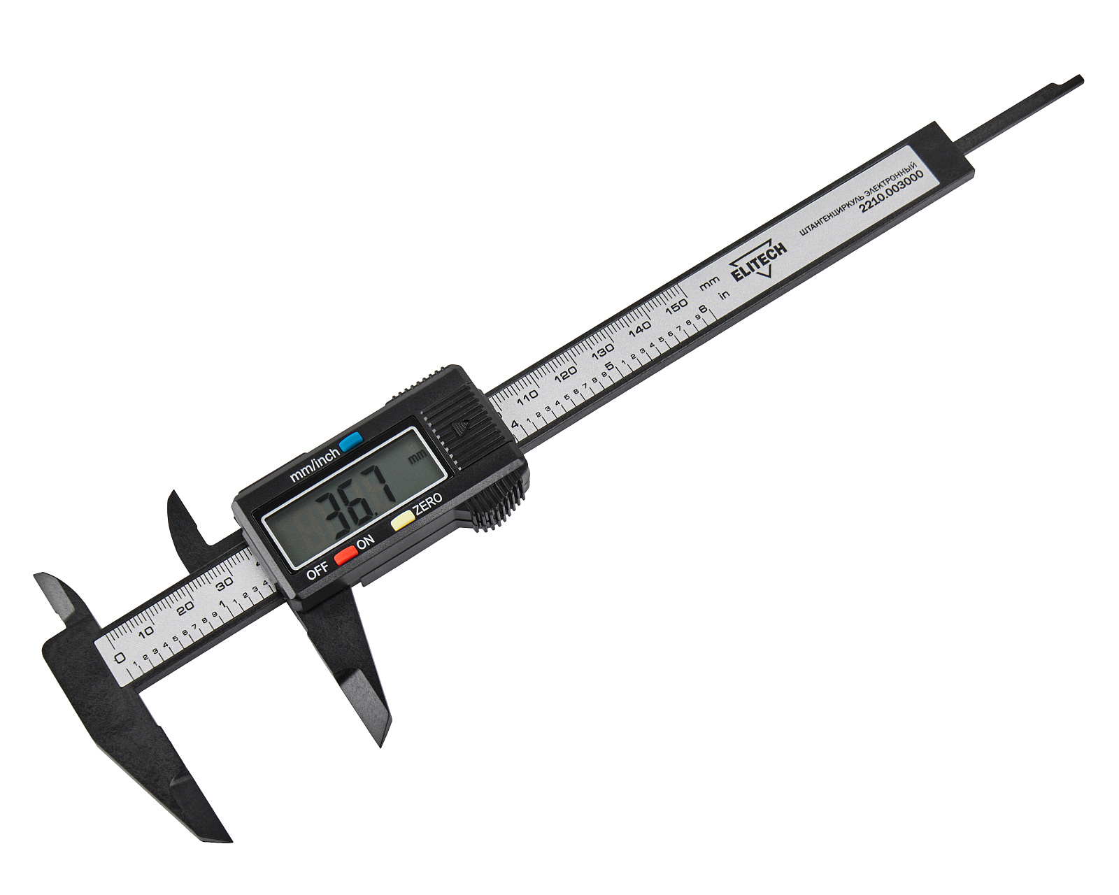 Штангенциркуль с цифровым дисплеем. Пластиковые губки. Выбор единицы измерения (дюймы или миллиметры). Измеряет внутренние и наружные диаметры, глубину отверстий и пазов.