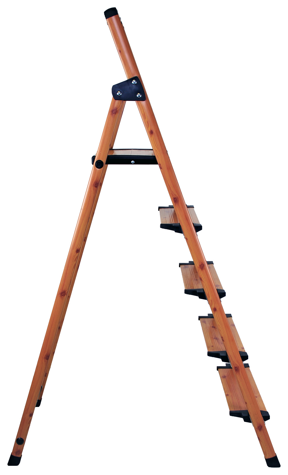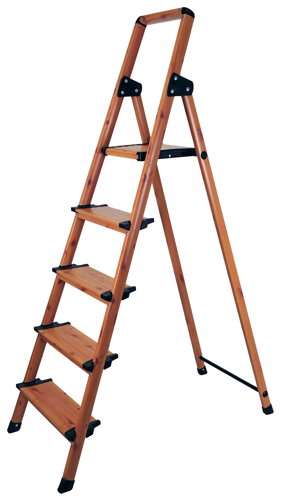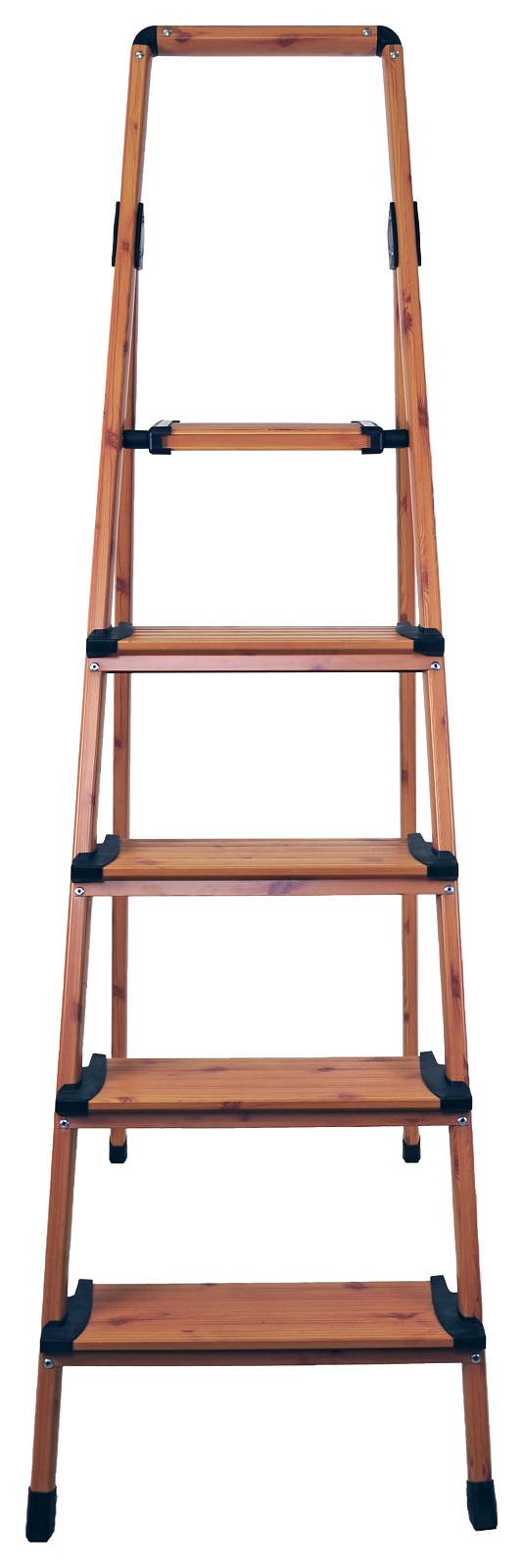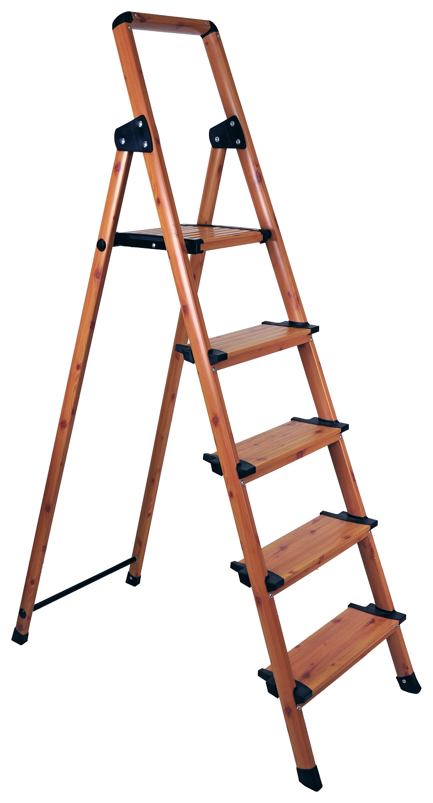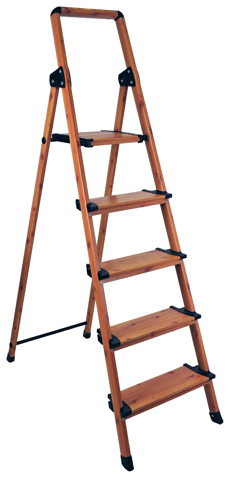 Раскладная стремянка из алюминиевого профиля с защитным покрытием и с пятью ступеньками, высотой 165 см, собственной массой 4,9 кг, позволяет выдерживать нагрузку до 150 кг. Глубина ступени 13 см. Цвет под дерево, покрытие - краска.