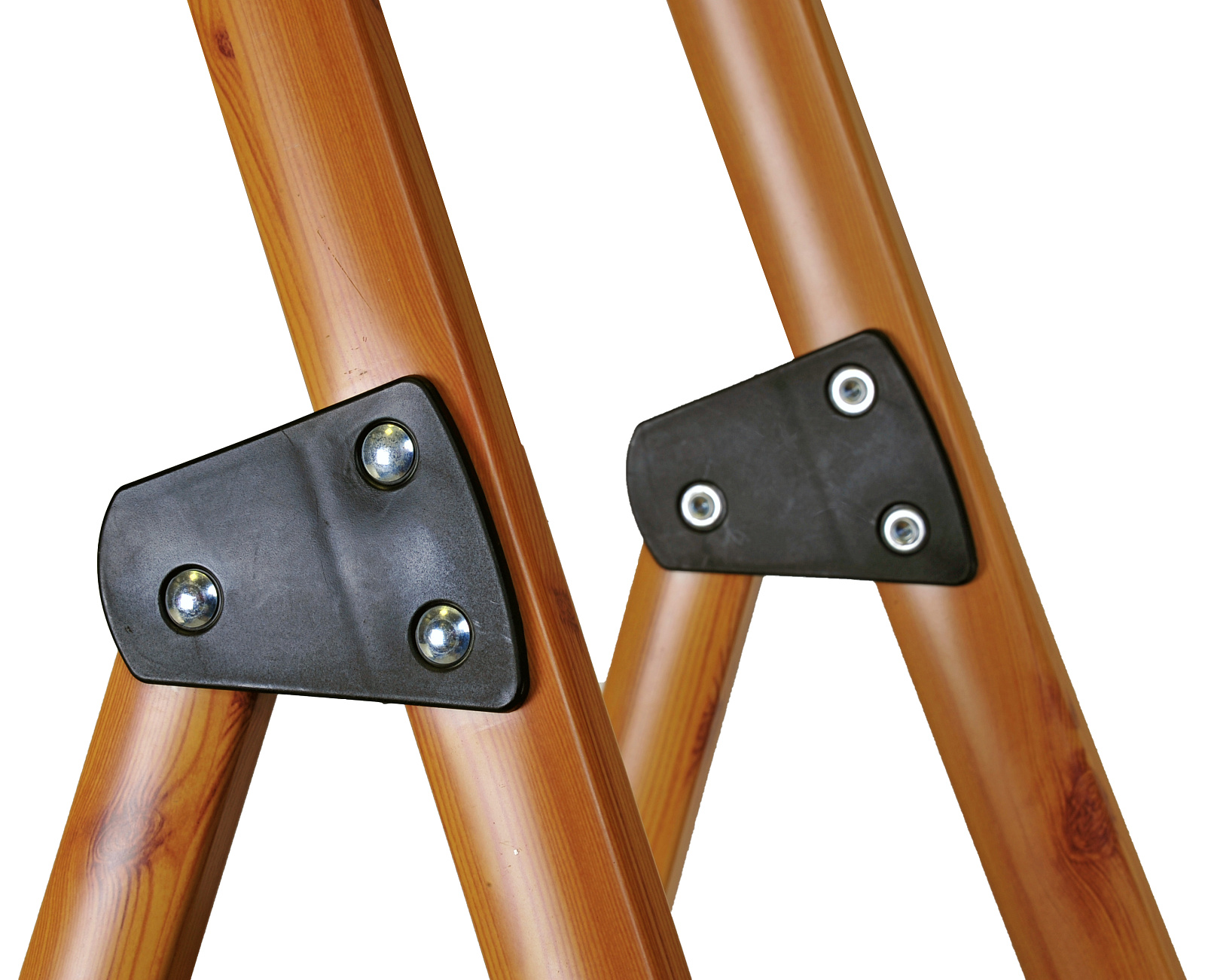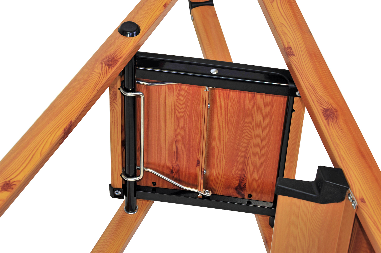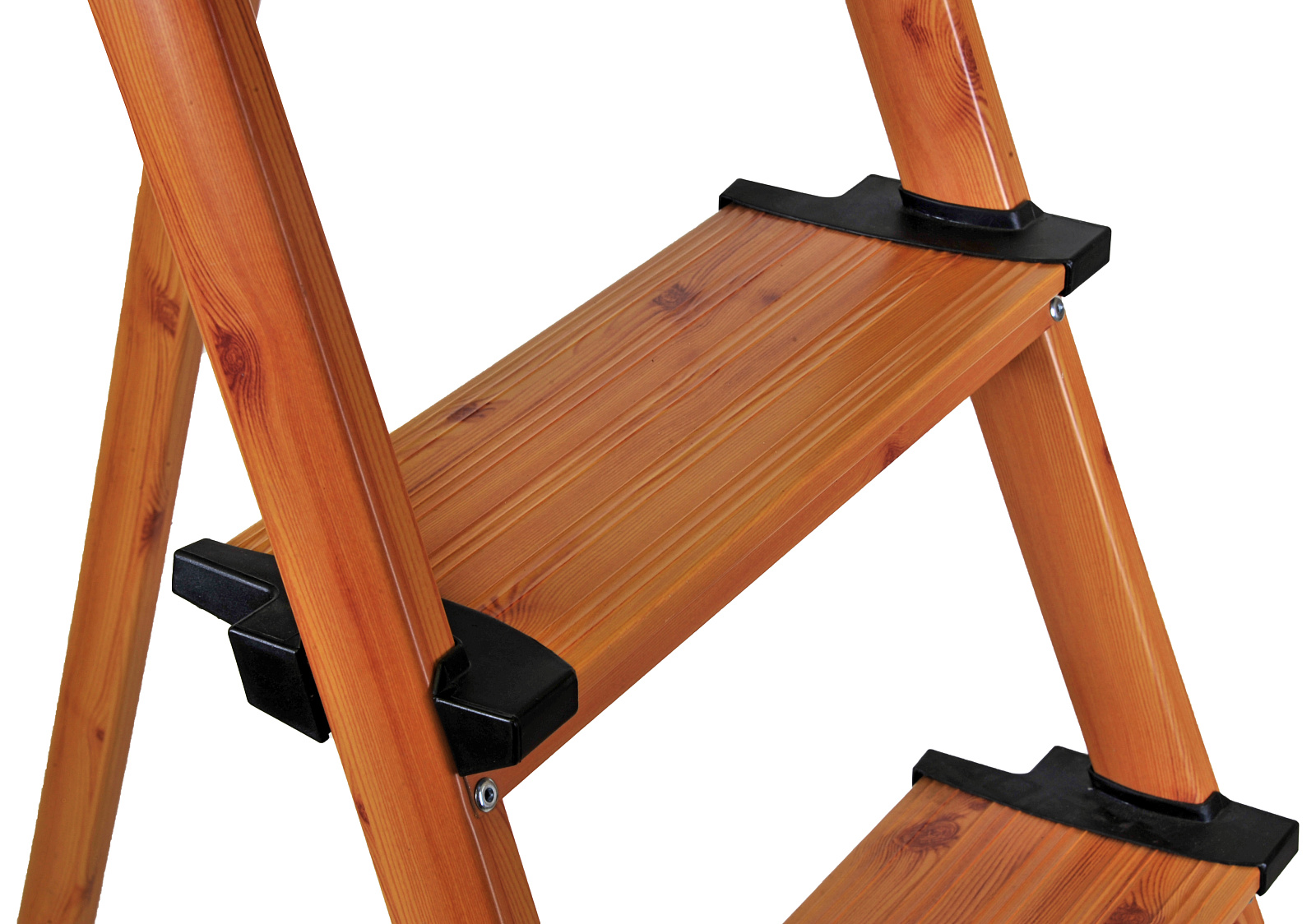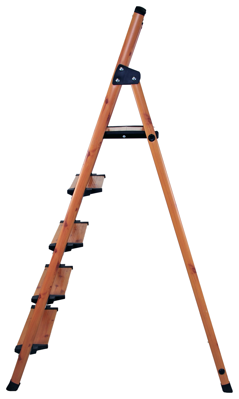 Раскладная стремянка из алюминиевого профиля с защитным покрытием и с пятью ступеньками, высотой 165 см, собственной массой 4,9 кг, позволяет выдерживать нагрузку до 150 кг. Глубина ступени 13 см. Цвет под дерево, покрытие - краска.