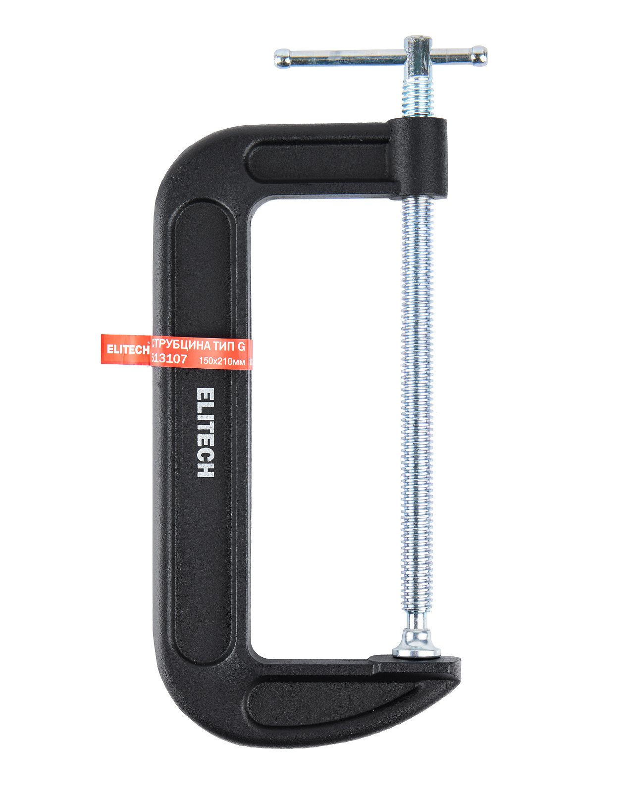 G-образная литая струбцина 215х85 мм из высокопрочного чугуна со стальным винтом и подвижной опорной пяткой, используется для усиленной фиксации деталей и заготовок.