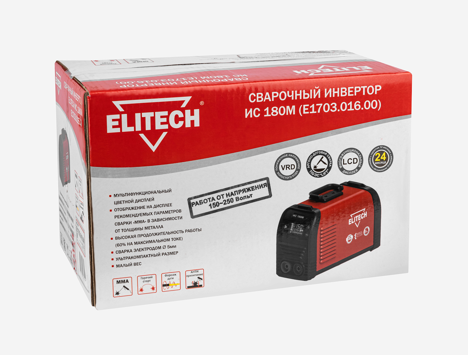 Сварочный инвертор ИС 180М (Е1703.016.00) для сварки ММА (электродуговая сварка электродом с флюсом) с возможностью аргоно-дуговой сварки TIG (сварка неплавящимся вольфрамовым электродом в среде защитного газа аргон). Параметры сварки отображаются на многофункциональном цифровом дисплее.
