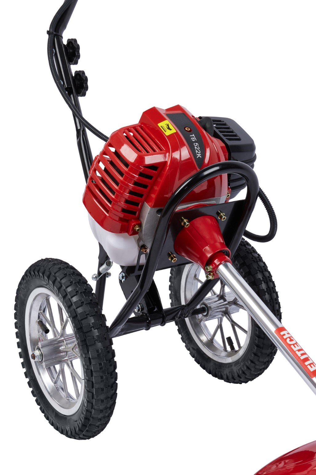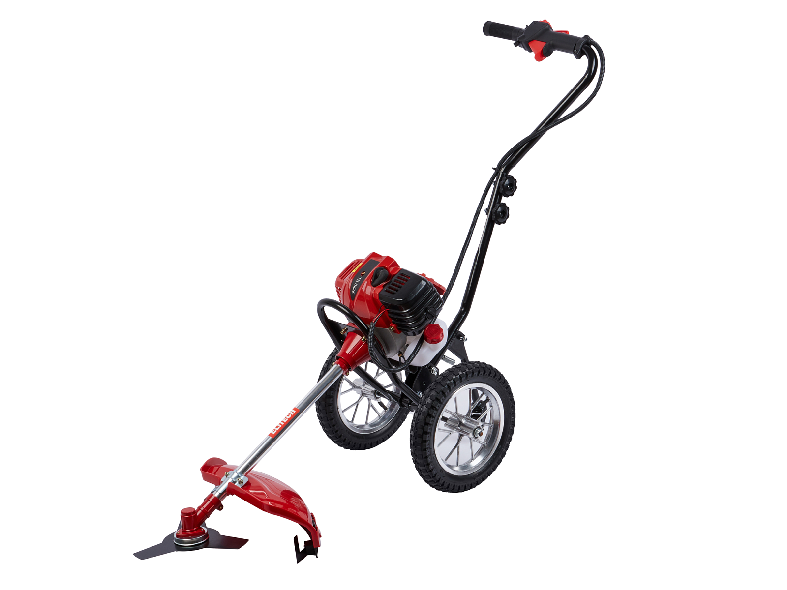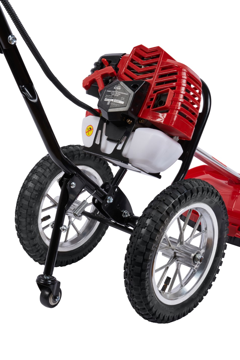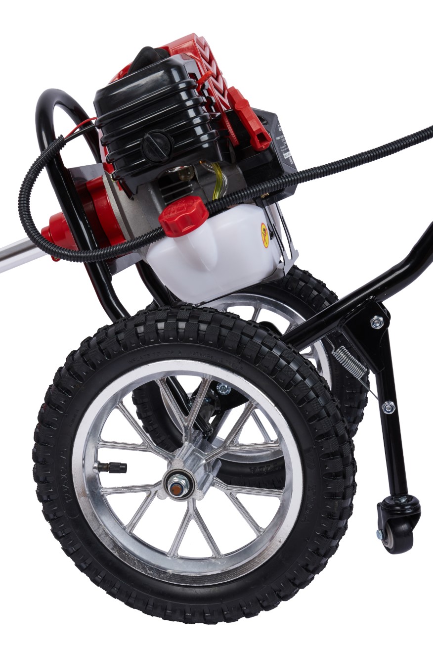 Двухколесный бензиновый триммер с 2-тактным двигателем мощностью 2,4 л.с. с полуавтоматической головкой для лески с шириной обработки 440 мм, используется для кошения, в том числе и переросшей травы на пересечённой местности, как на приусадебных и придомовых территориях, так и для использования специалистами служб благоустройства и озеленения в коммерческих целях.