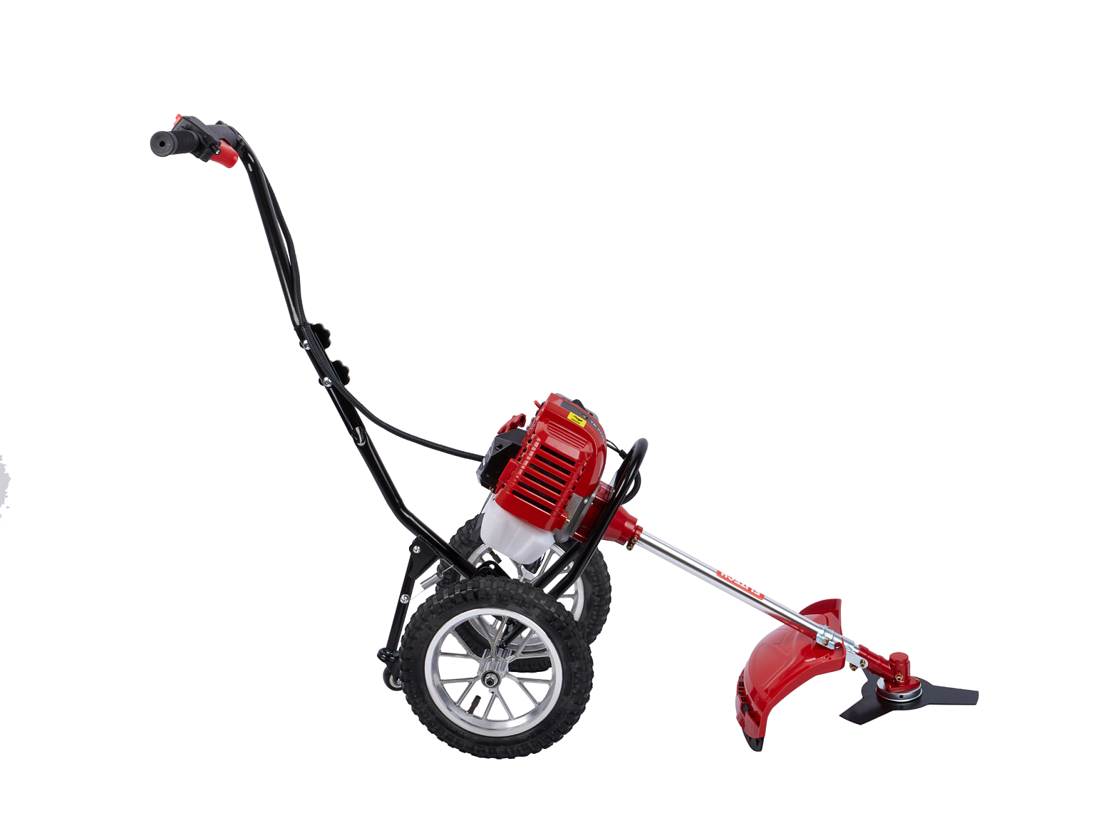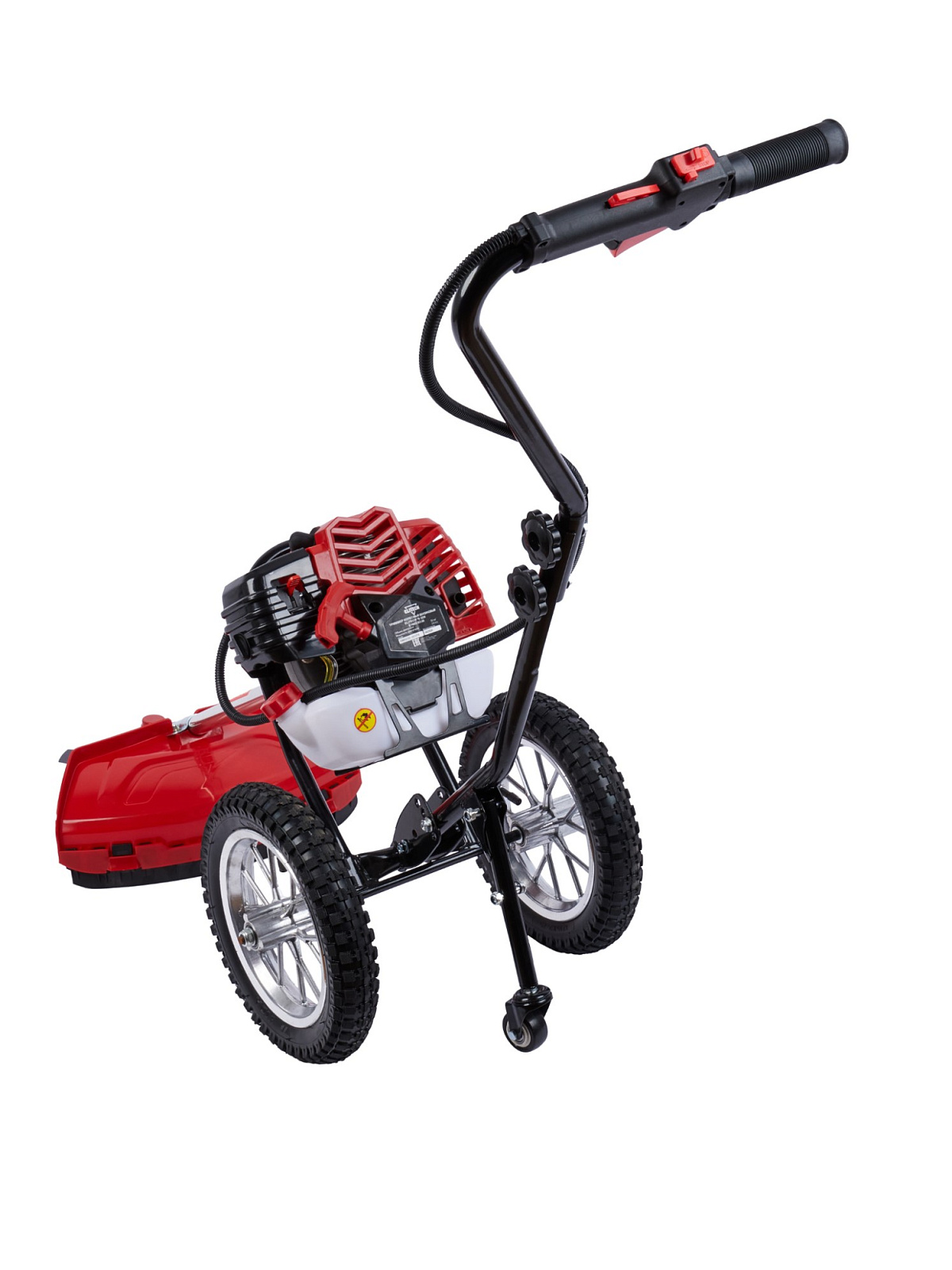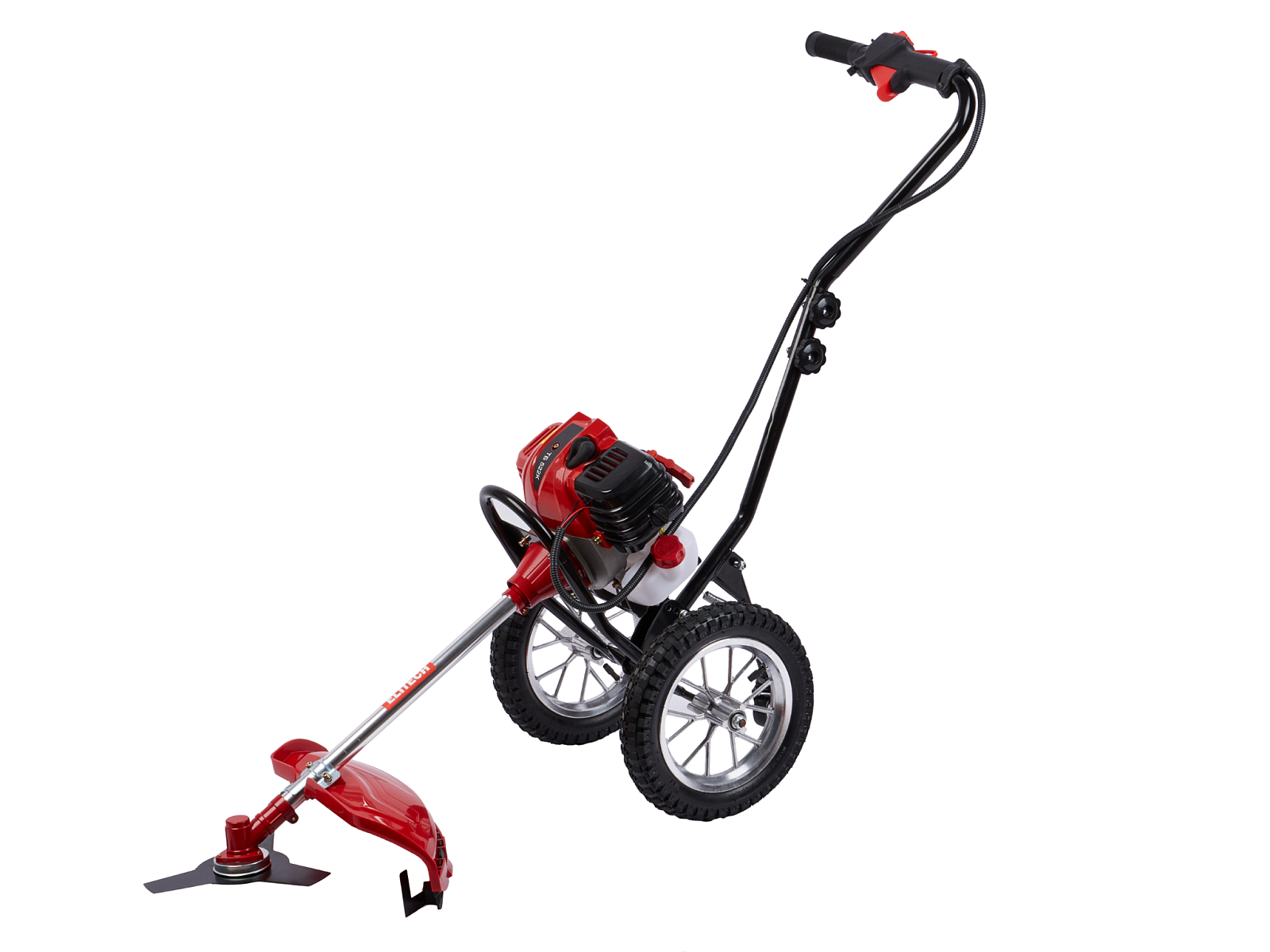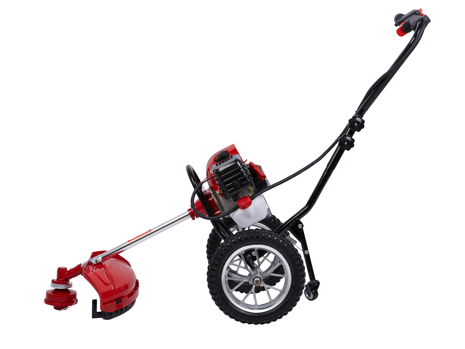 Двухколесный бензиновый триммер с 2-тактным двигателем мощностью 2,4 л.с. с полуавтоматической головкой для лески с шириной обработки 440 мм, используется для кошения, в том числе и переросшей травы на пересечённой местности, как на приусадебных и придомовых территориях, так и для использования специалистами служб благоустройства и озеленения в коммерческих целях.