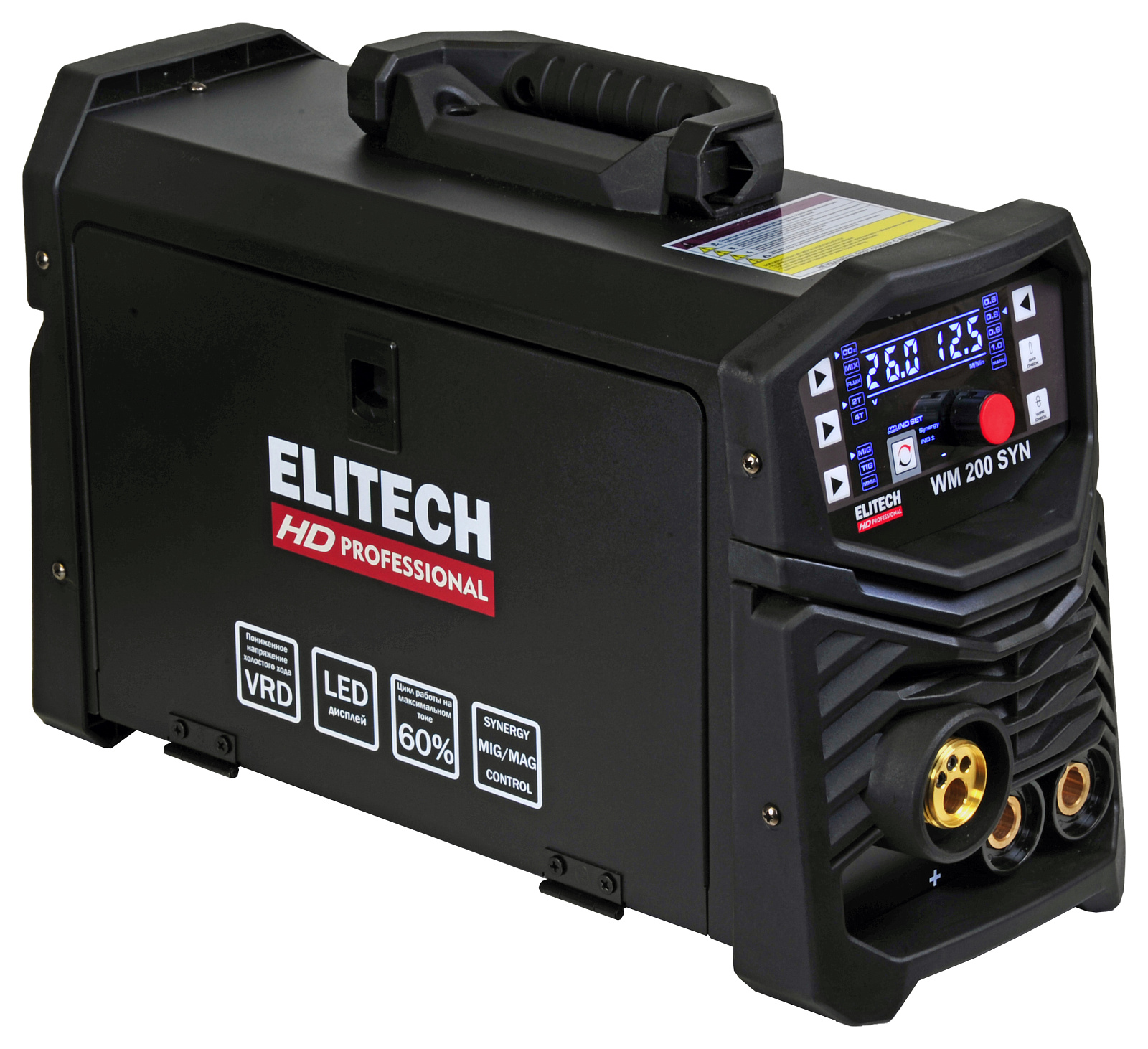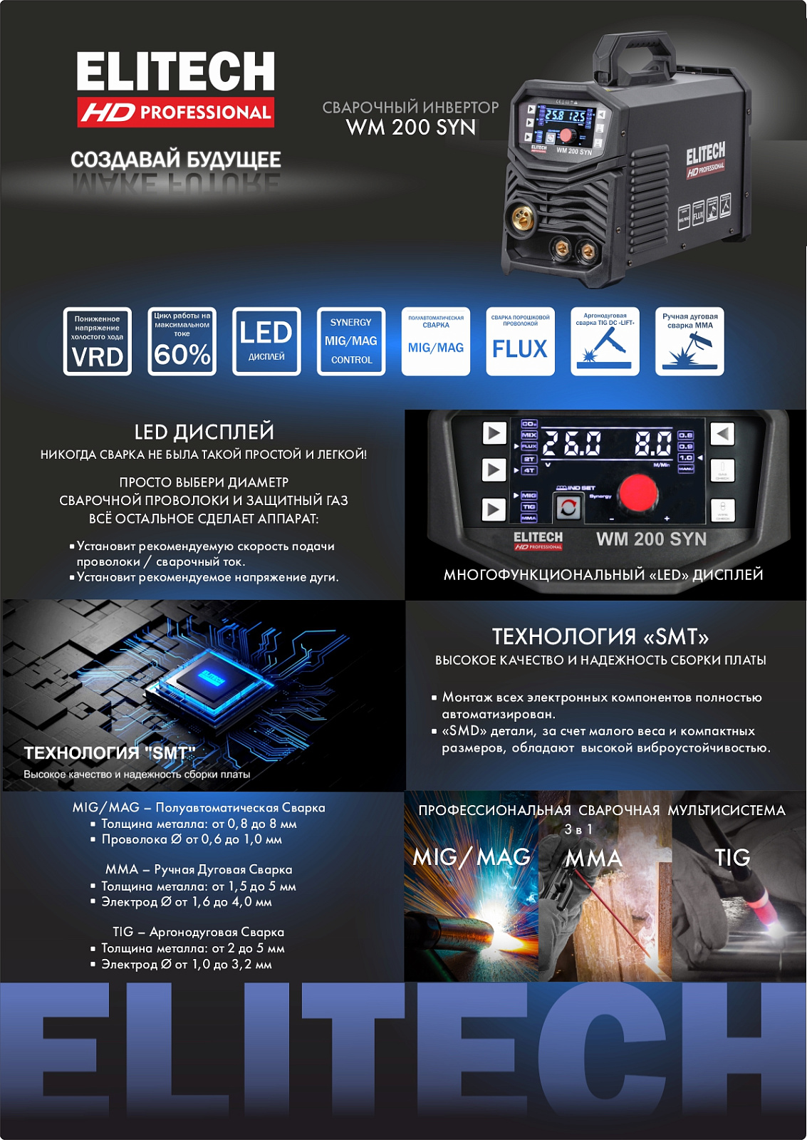 Мультисистема ELITECH HD WM 200 SYN предназначена для полуавтоматической сварки проволокой в среде защитного газа (MIG / MAG), а также порошковой проволокой (FLUX) без газа, с возможностью осуществлять сварку покрытым штучным электродом (MMA) или вольфрамовым неплавящимся электродом в среде инертных газов на постоянном токе (TIG-аргонодуговая сварка).